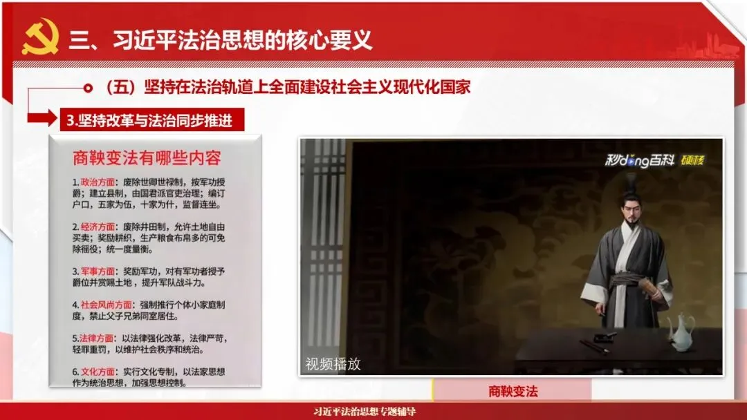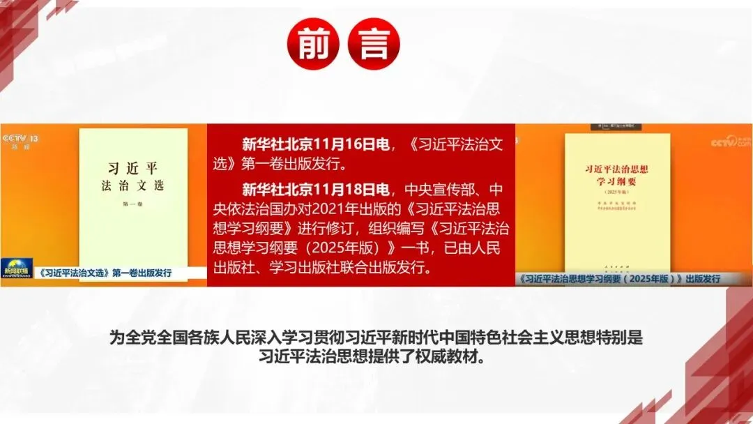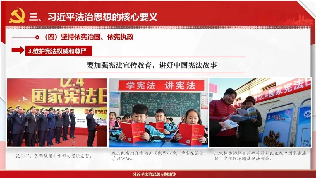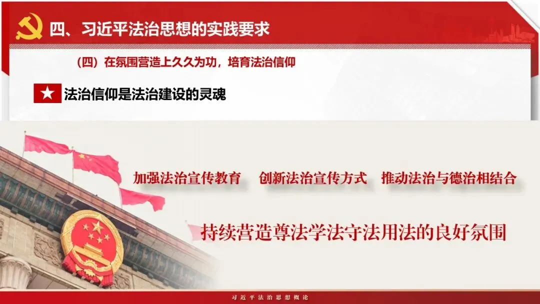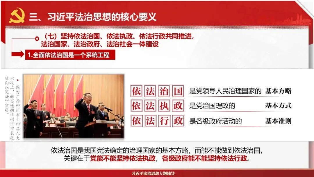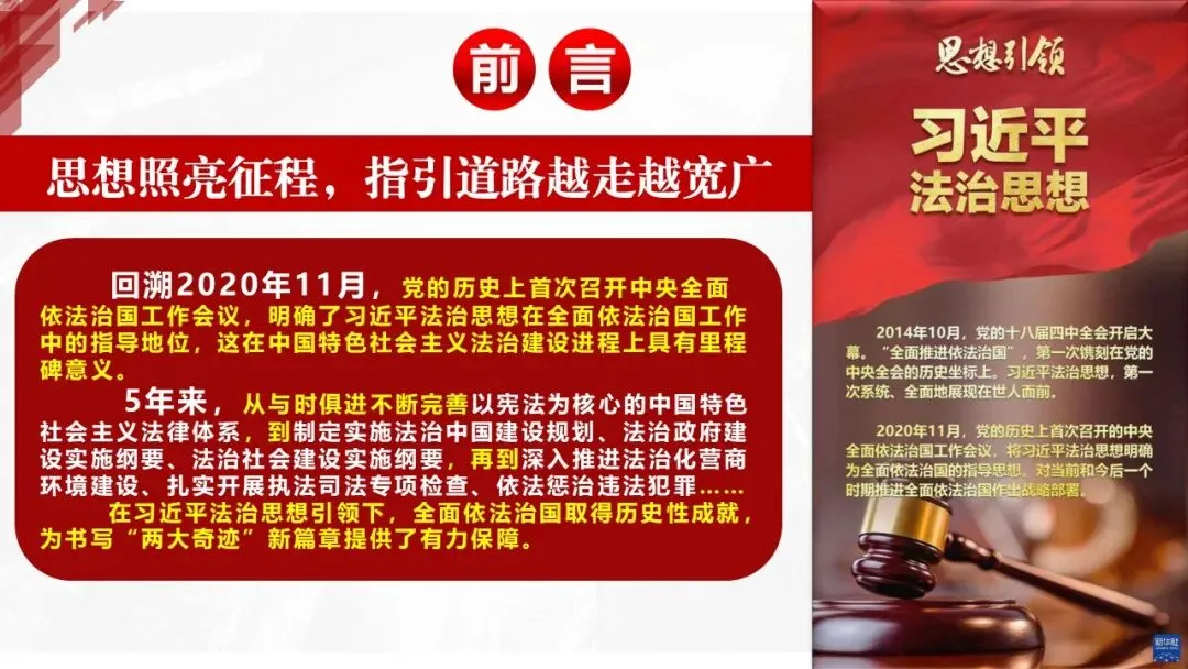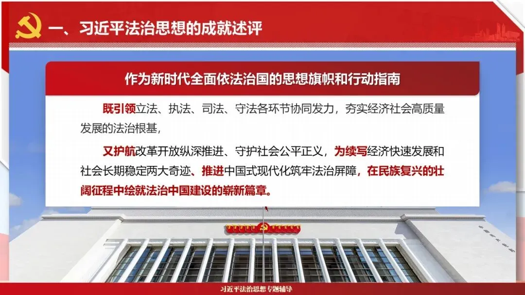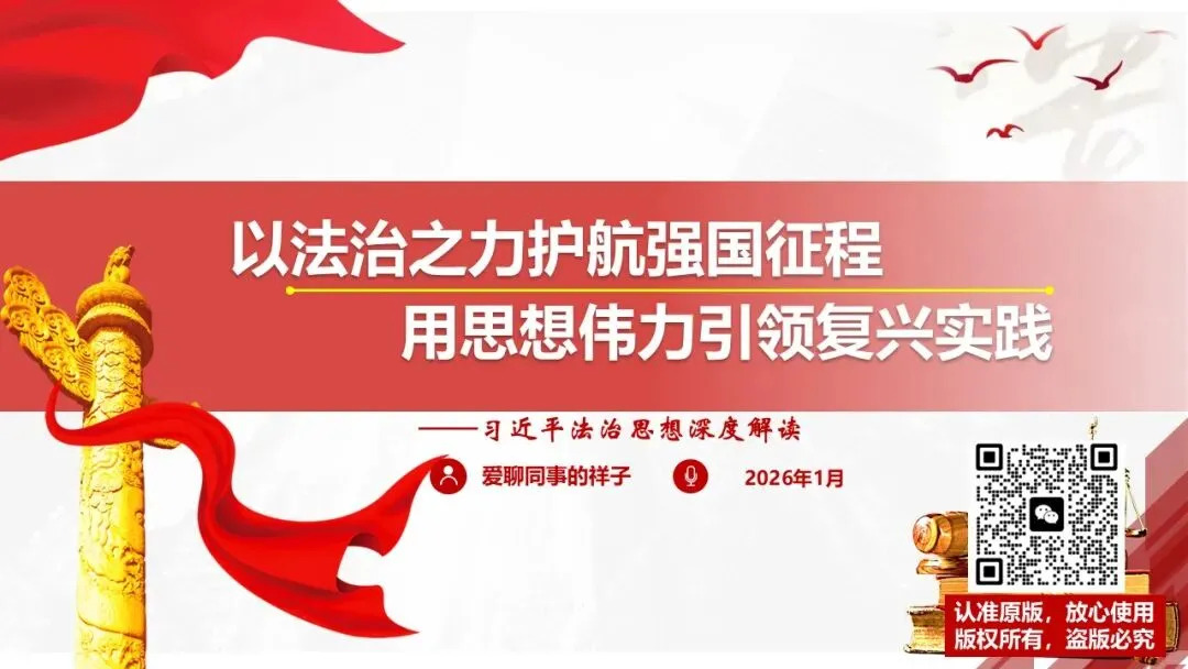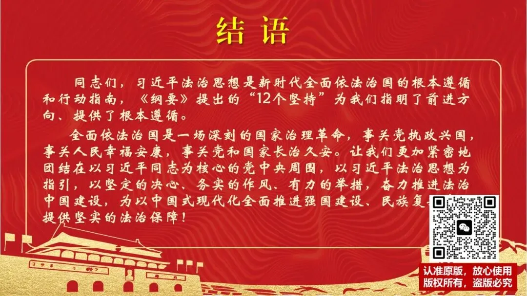 2026课程体系和教学大纲系列:法治思想辅导PPT,讲稿核心要义聚焦纲要“12个坚持”,融入新旧解读,引申成就、背景、实践,大量正反案例,充分增强讲稿生动性,已多次核实修正,确保权威引用。PPT版面设计风格采用大量高清图片、视频,结合图表运用,清晰呈现要点【版权声明】本PPT版设及讲稿已申请知识版权登记,提醒警示!交流认准标注原创及时持续更新、放心使用,其他渠道获取无版权必追究!篇幅部分展示,更多思政课程教学大纲系列、思想、论述、能力、本领类以及条例规定等辅导课件,及时更新。