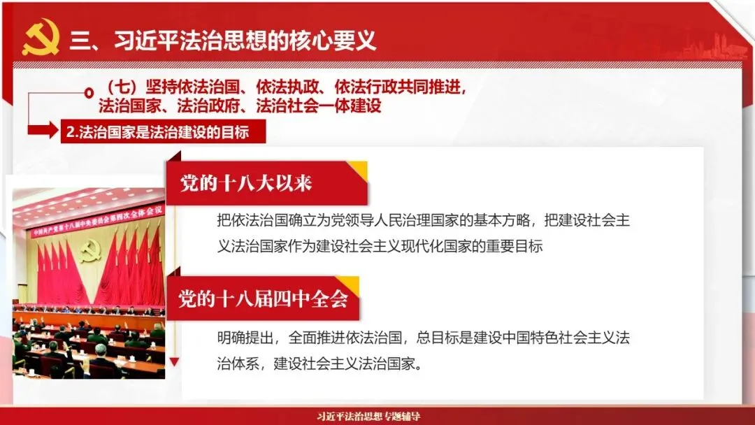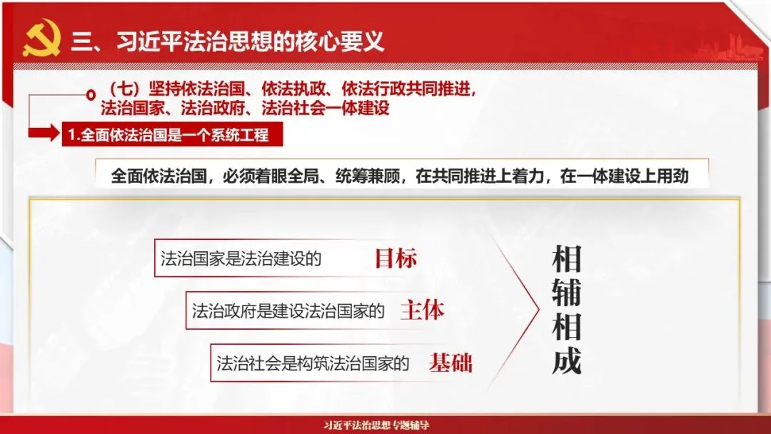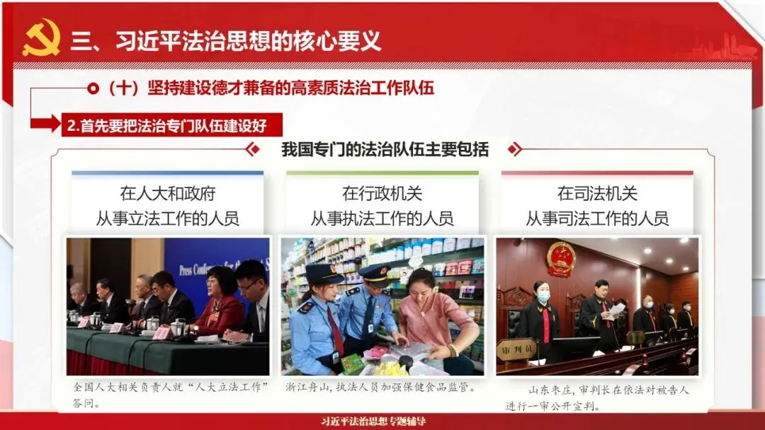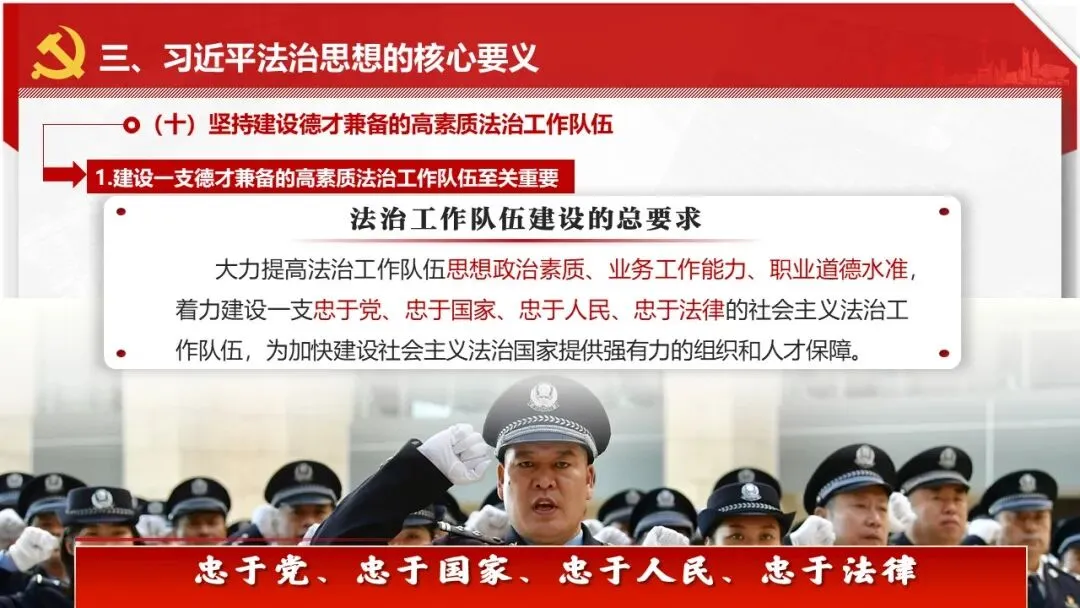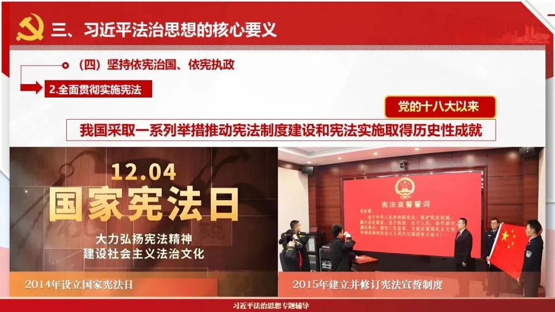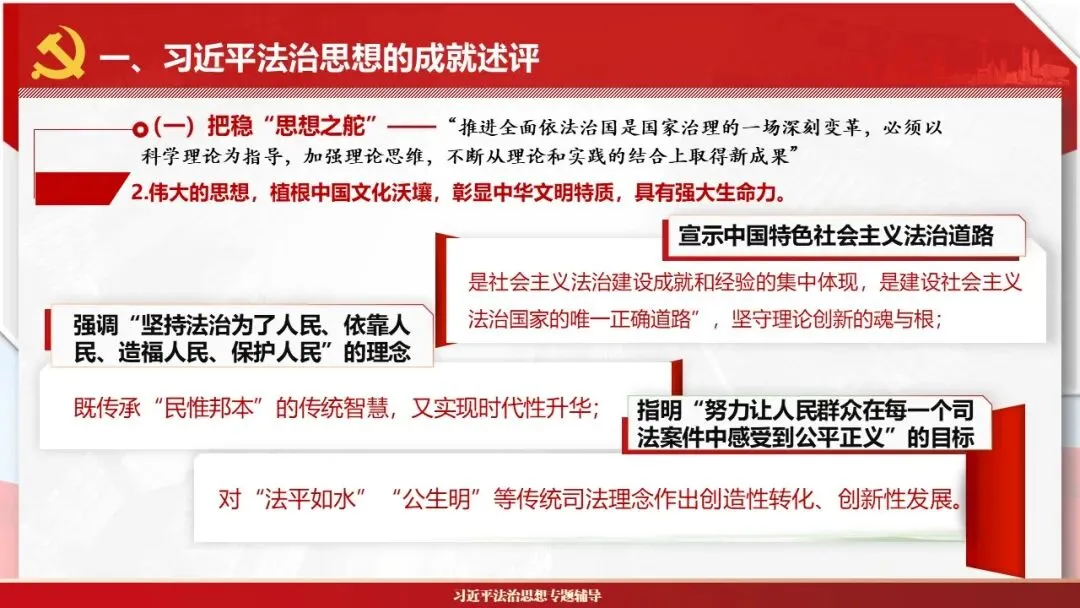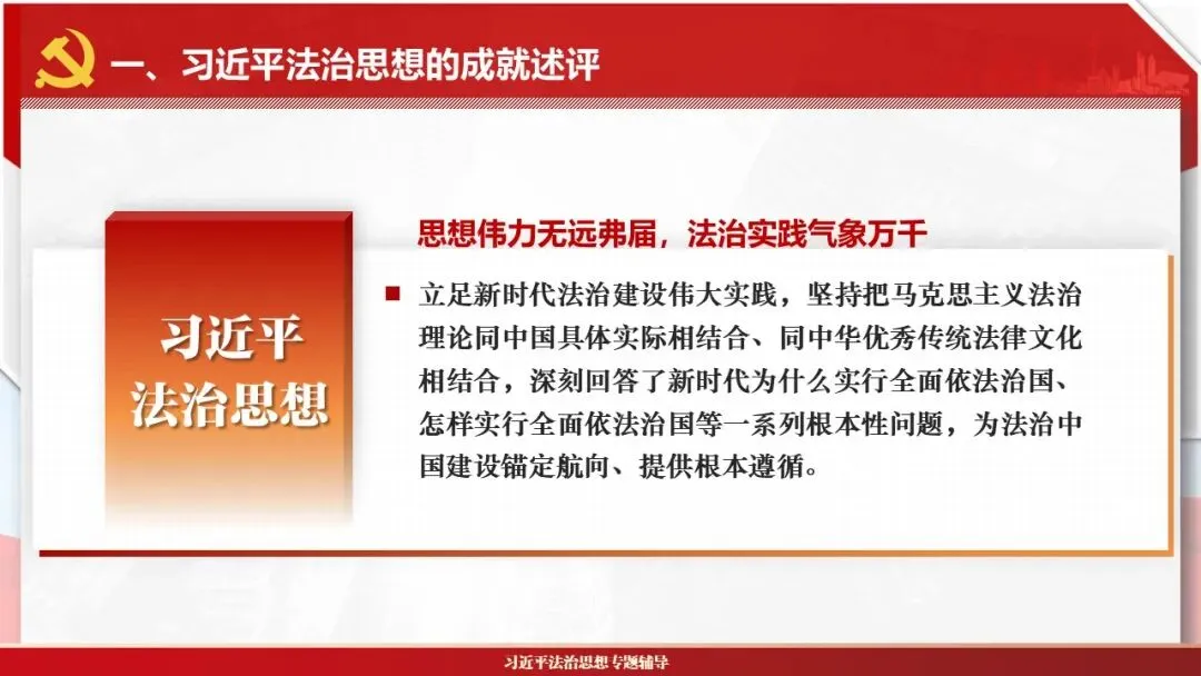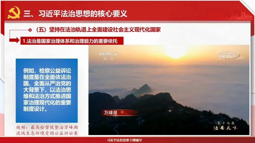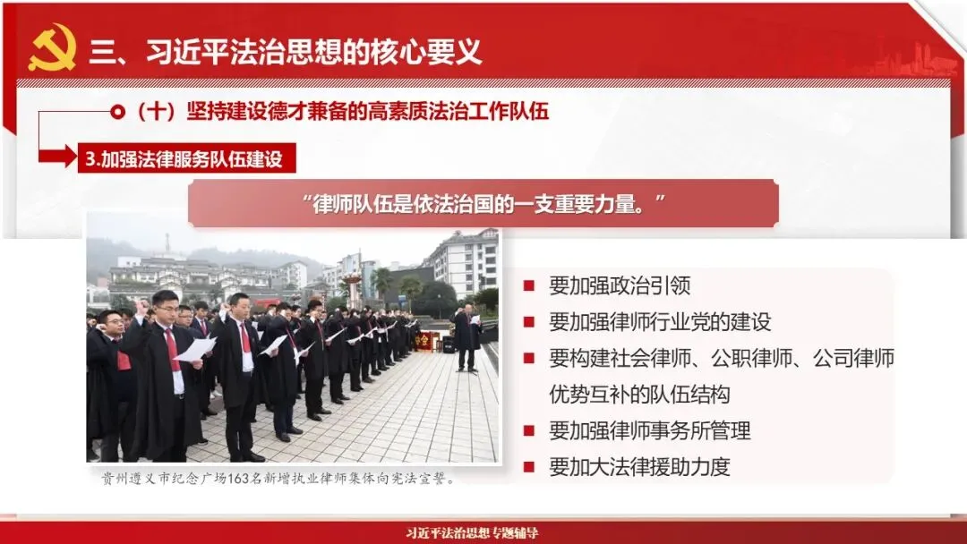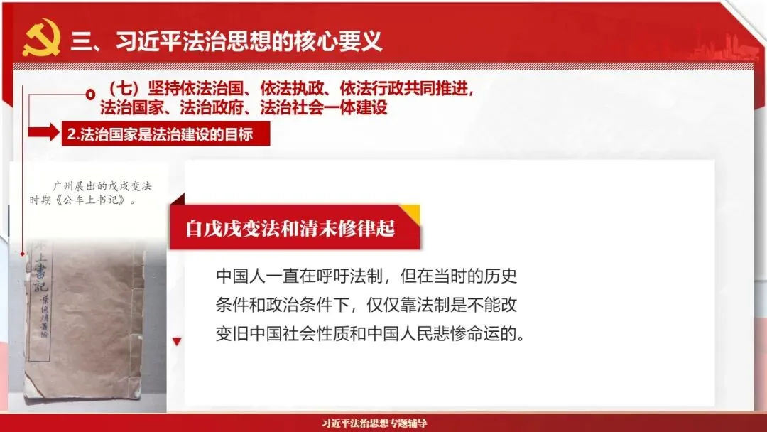 2026课程体系和教学大纲系列:法治思想辅导PPT,讲稿核心要义聚焦纲要“12个坚持”,融入新旧解读,引申成就、背景、实践,大量正反案例,充分增强讲稿生动性,已多次核实修正,确保权威引用。PPT版面设计风格采用大量高清图片、视频,结合图表运用,清晰呈现要点【版权声明】本PPT版设及讲稿已申请知识版权登记,提醒警示!交流认准标注原创及时持续更新、放心使用,其他渠道获取无版权必追究!篇幅部分展示,更多思政课程教学大纲系列、思想、论述、能力、本领类以及条例规定等辅导课件,及时更新。