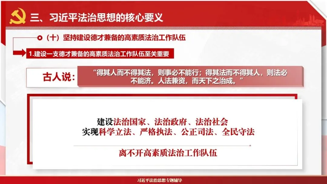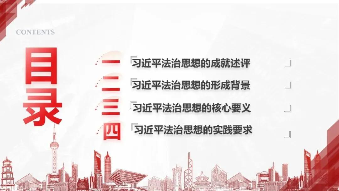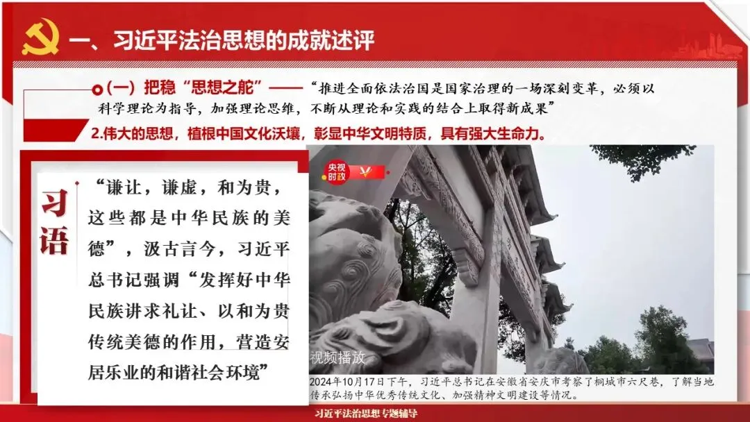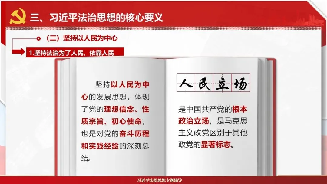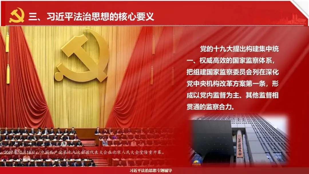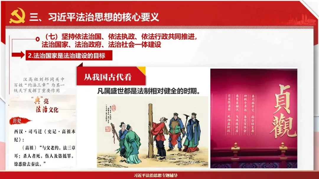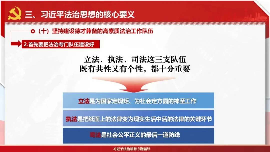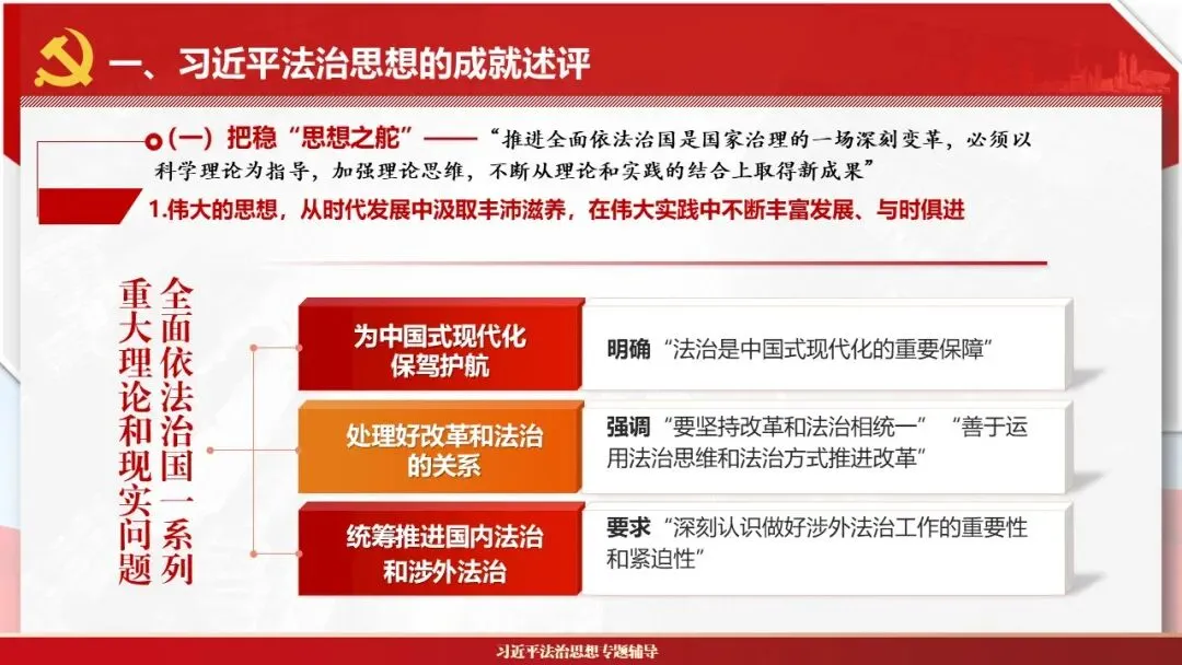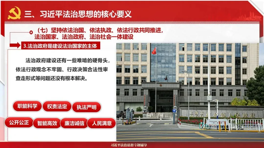 2026课程体系和教学大纲系列:法治思想辅导PPT,讲稿核心要义聚焦纲要“12个坚持”,融入新旧解读,引申成就、背景、实践,大量正反案例,充分增强讲稿生动性,已多次核实修正,确保权威引用。PPT版面设计风格采用大量高清图片、视频,结合图表运用,清晰呈现要点【版权声明】本PPT版设及讲稿已申请知识版权登记,提醒警示!交流认准标注原创及时持续更新、放心使用,其他渠道获取无版权必追究!篇幅部分展示,更多思政课程教学大纲系列、思想、论述、能力、本领类以及条例规定等辅导课件,及时更新。