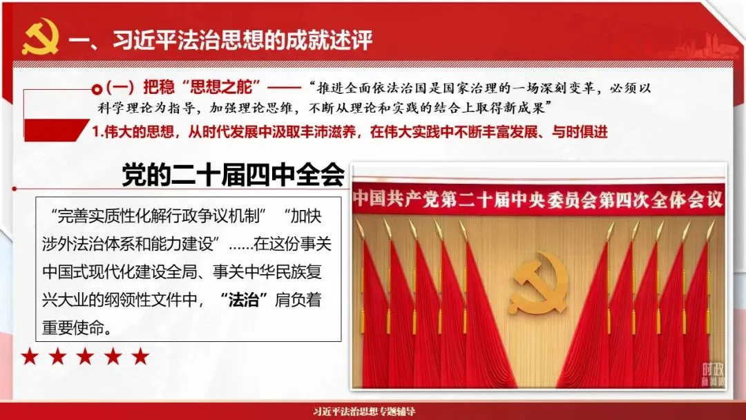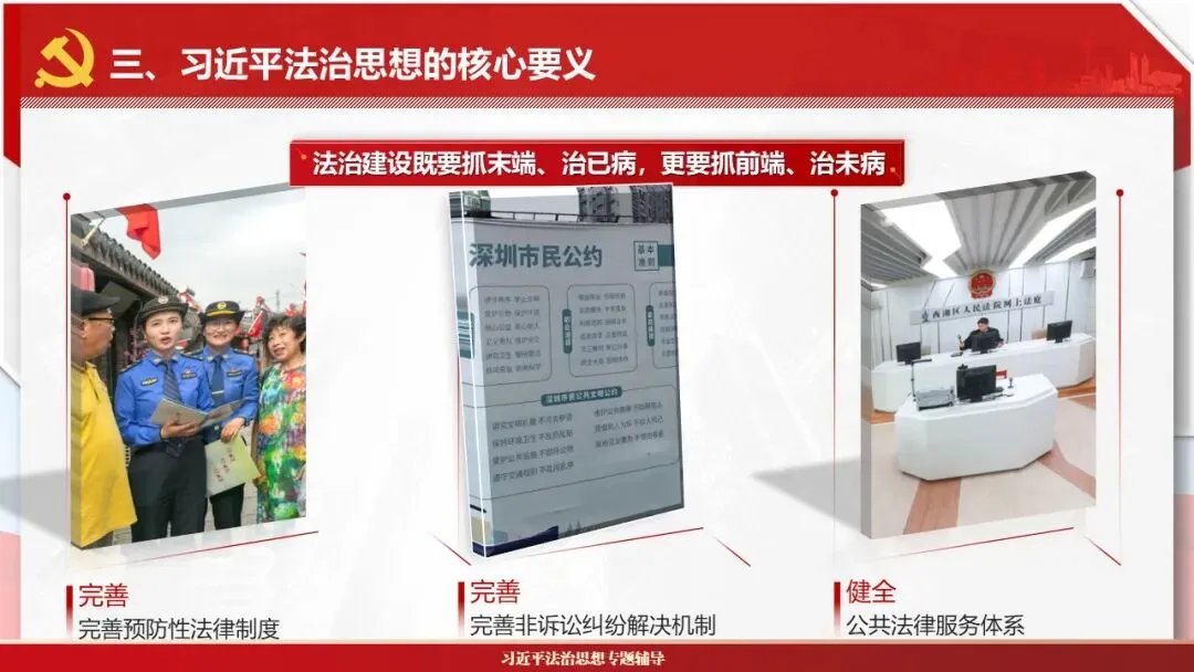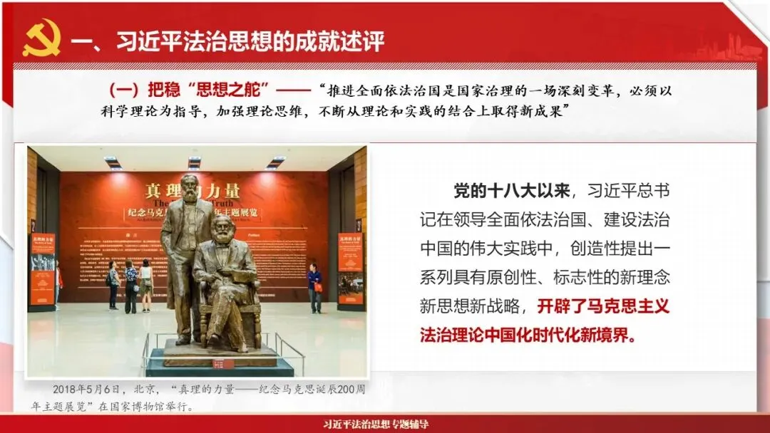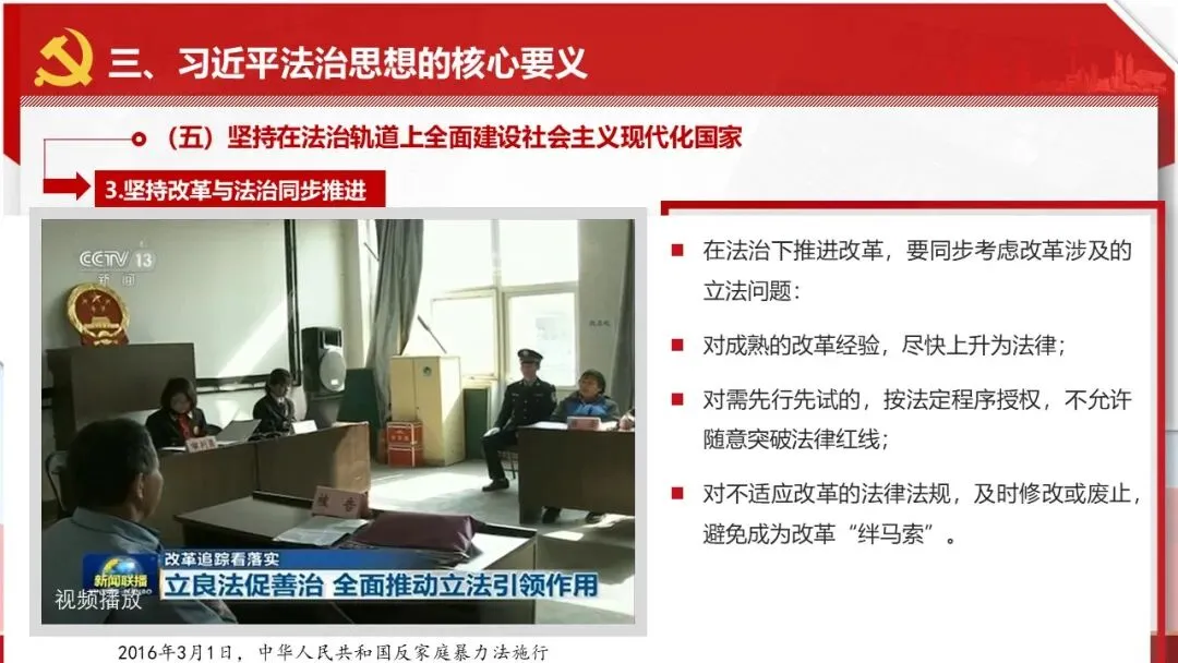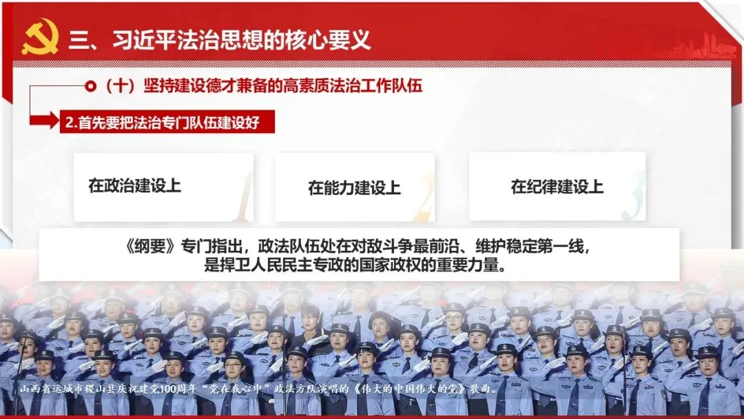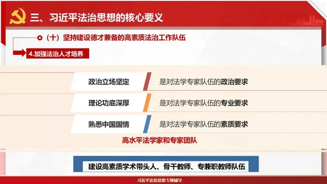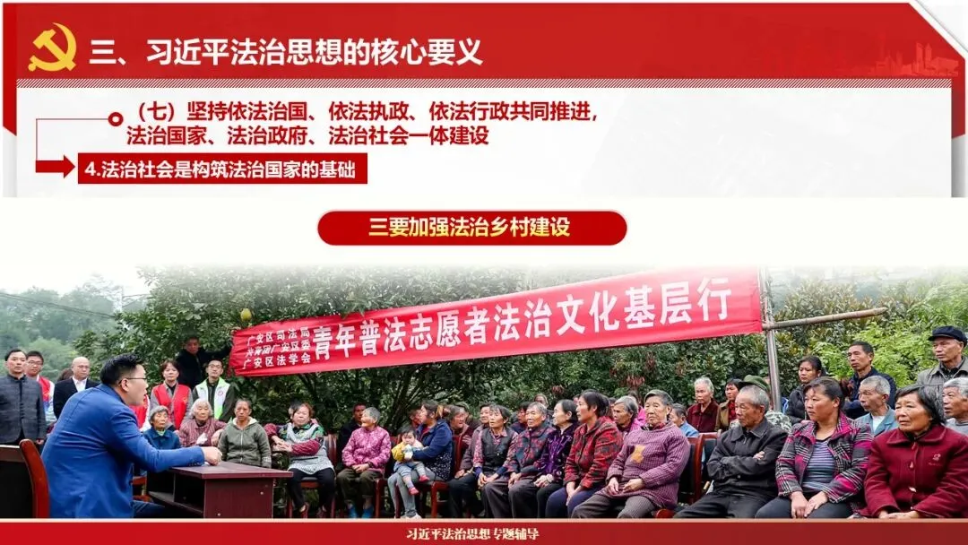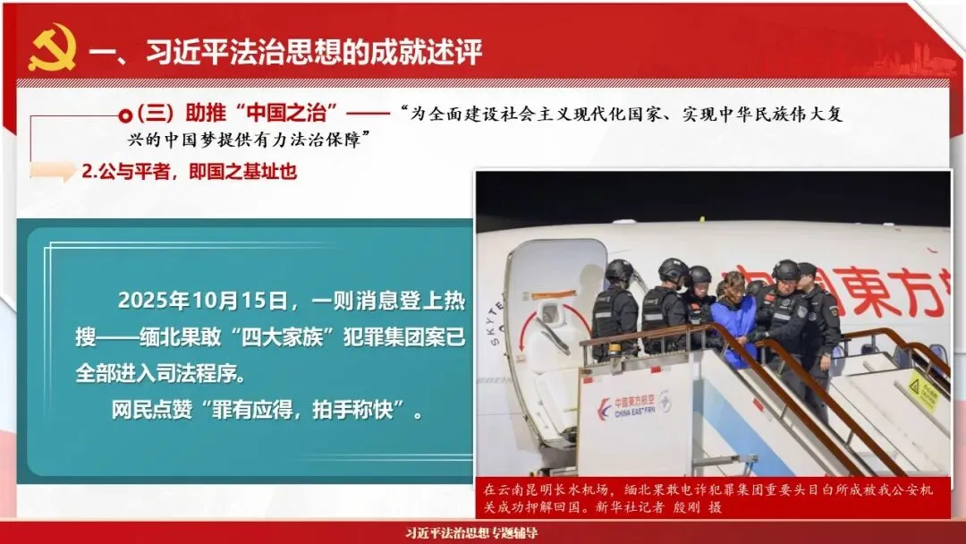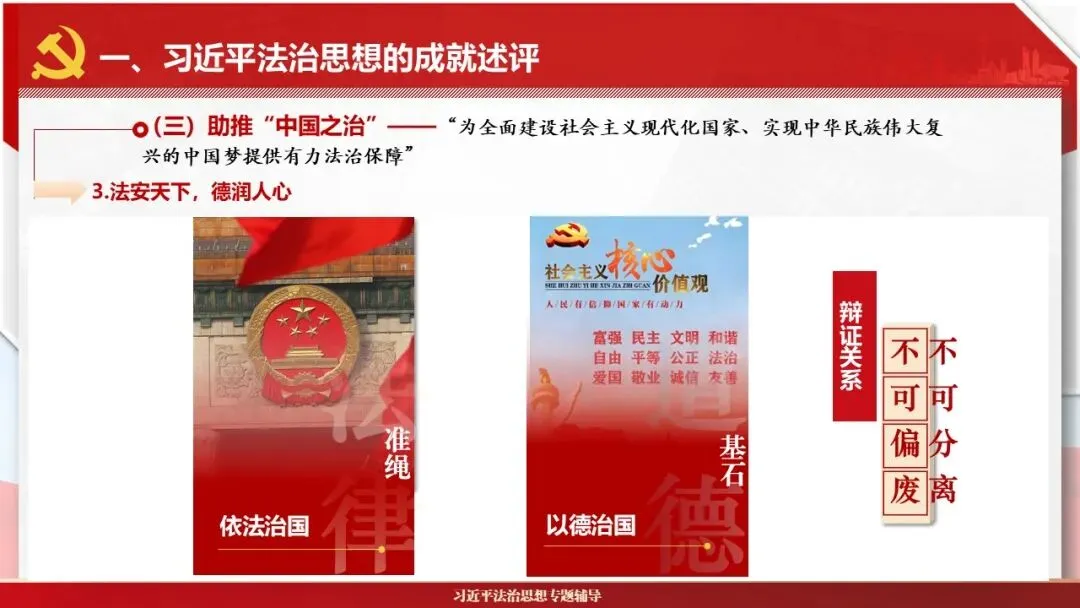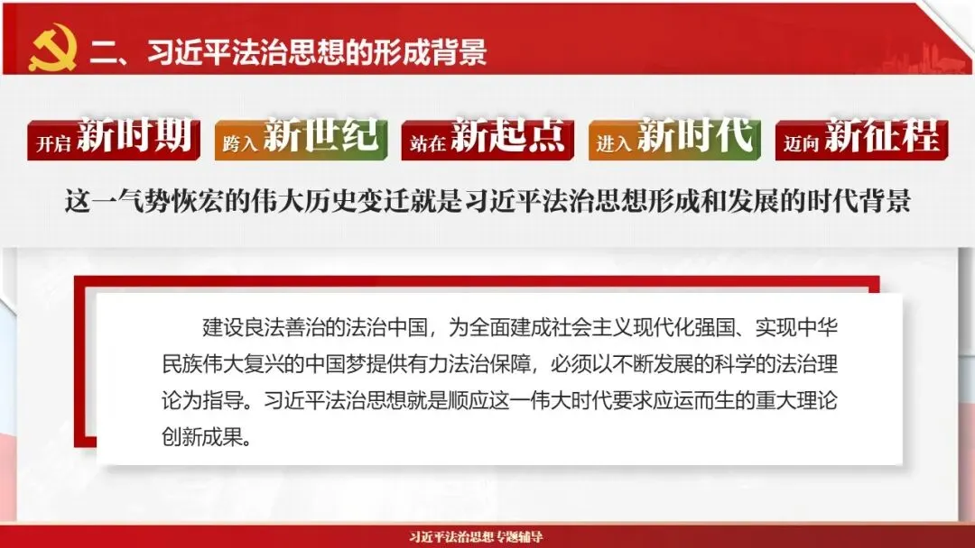 2026课程体系和教学大纲系列:法治思想辅导PPT,讲稿核心要义聚焦纲要“12个坚持”,融入新旧解读,引申成就、背景、实践,大量正反案例,充分增强讲稿生动性,已多次核实修正,确保权威引用。PPT版面设计风格采用大量高清图片、视频,结合图表运用,清晰呈现要点【版权声明】本PPT版设及讲稿已申请知识版权登记,提醒警示!交流认准标注原创及时持续更新、放心使用,其他渠道获取无版权必追究!篇幅部分展示,更多思政课程教学大纲系列、思想、论述、能力、本领类以及条例规定等辅导课件,及时更新。
