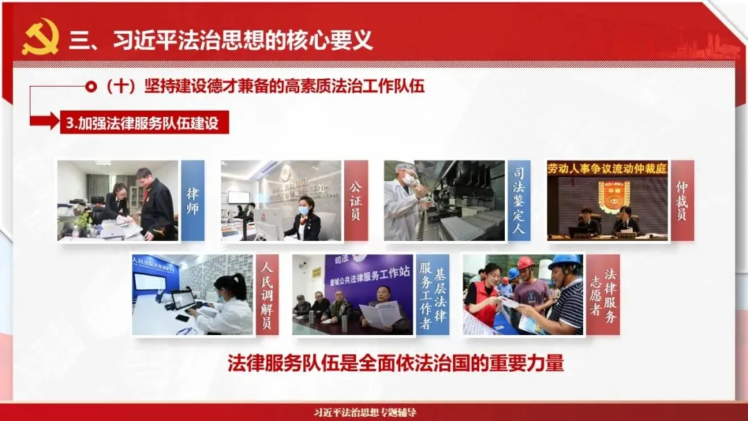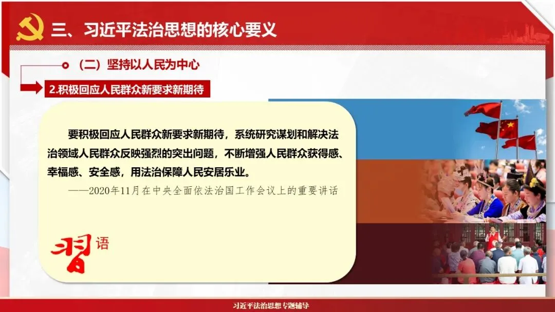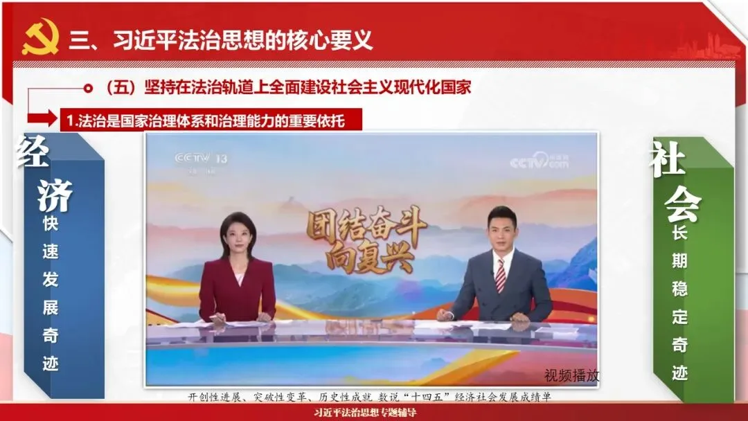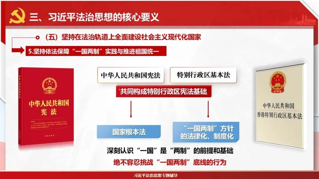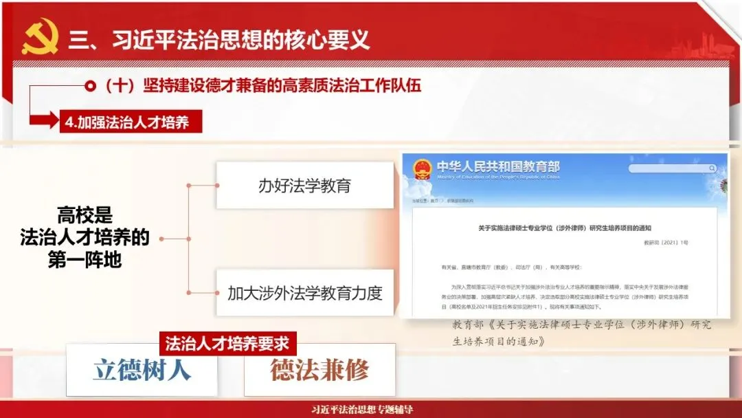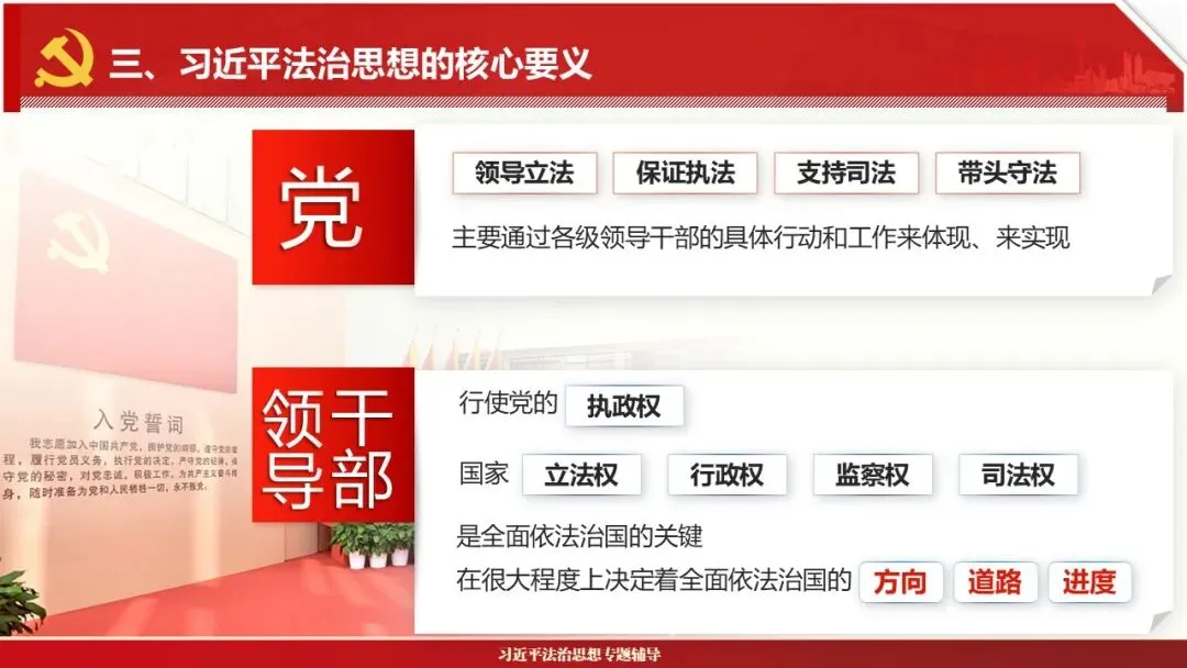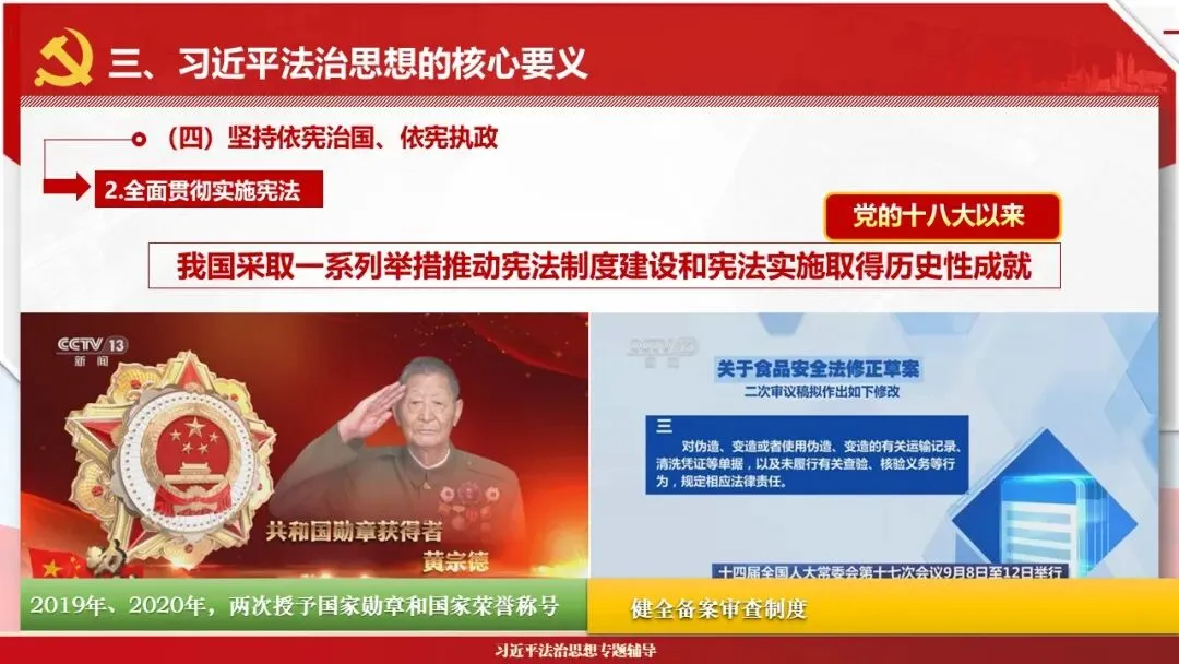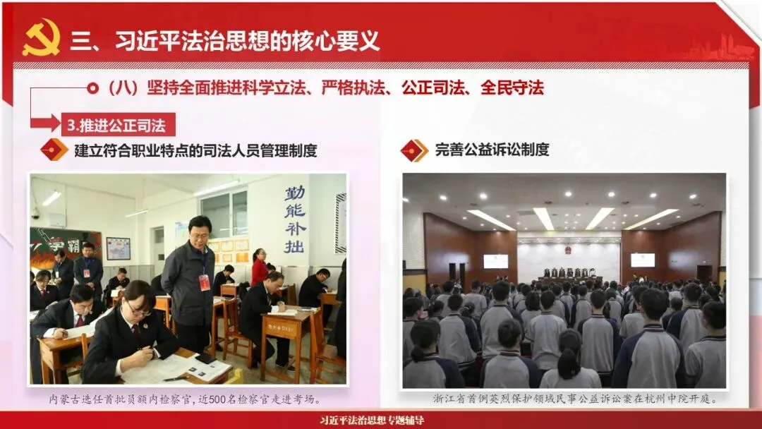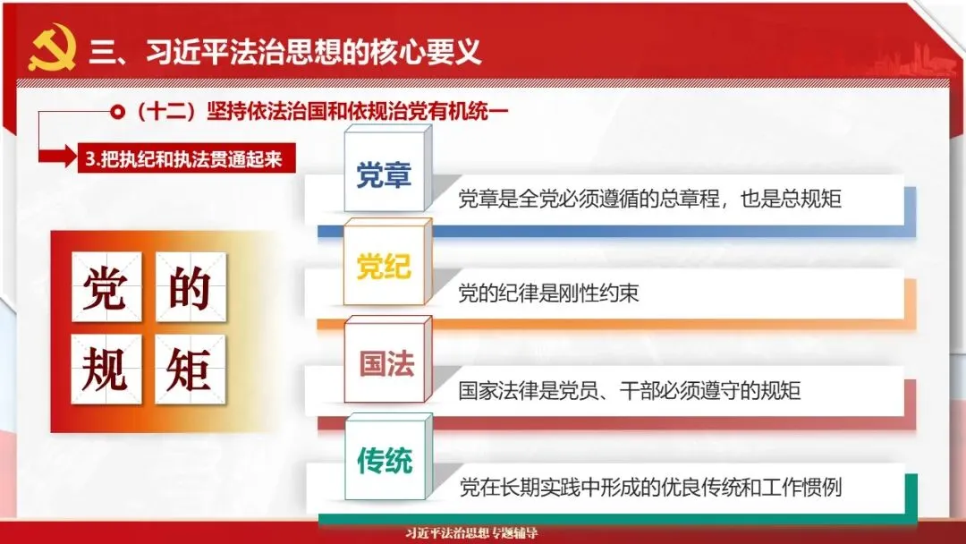 2026课程体系和教学大纲系列:法治思想辅导PPT,讲稿核心要义聚焦纲要“12个坚持”,融入新旧解读,引申成就、背景、实践,大量正反案例,充分增强讲稿生动性,已多次核实修正,确保权威引用。PPT版面设计风格采用大量高清图片、视频,结合图表运用,清晰呈现要点【版权声明】本PPT版设及讲稿已申请知识版权登记,提醒警示!交流认准标注原创及时持续更新、放心使用,其他渠道获取无版权必追究!篇幅部分展示,更多思政课程教学大纲系列、思想、论述、能力、本领类以及条例规定等辅导课件,及时更新。