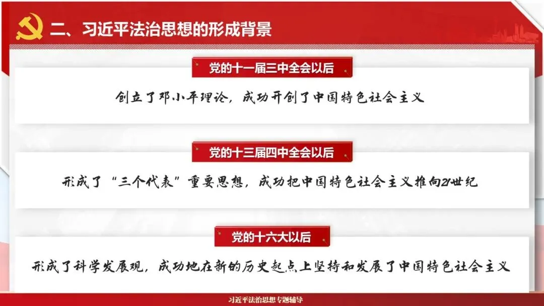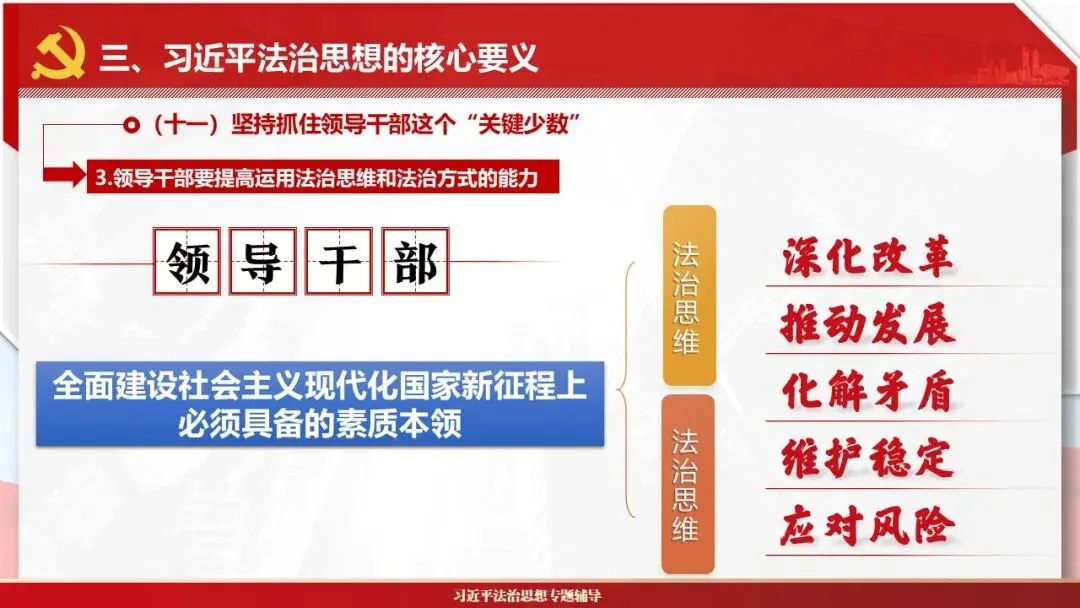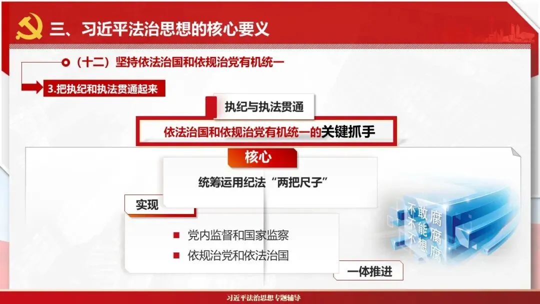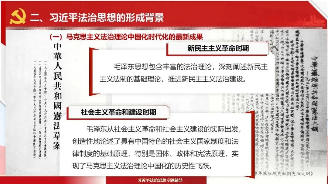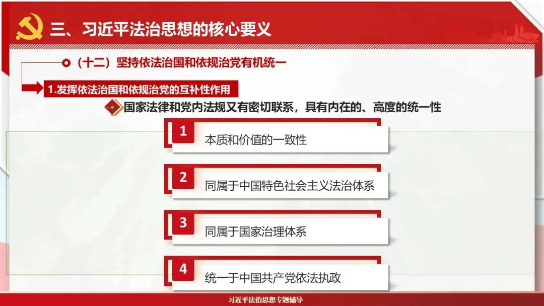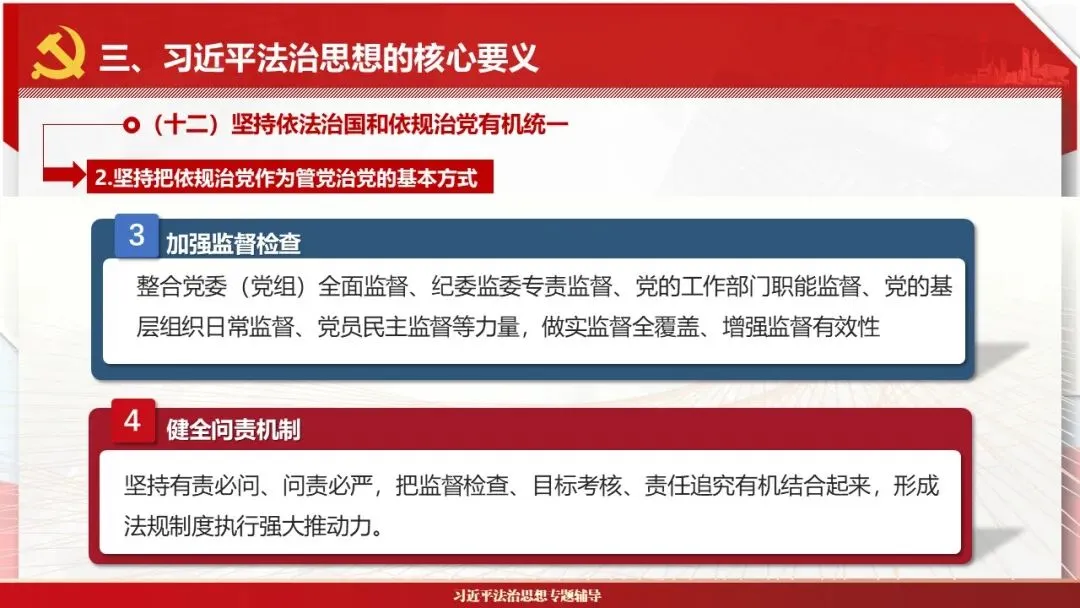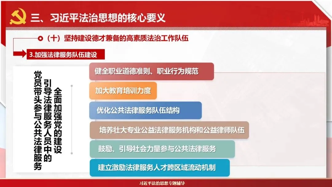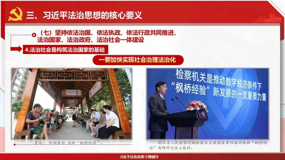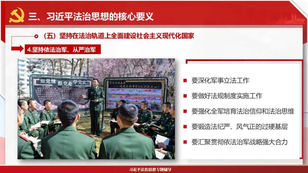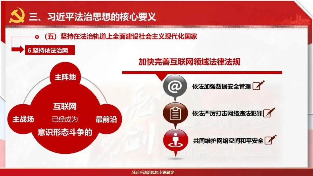 2026课程体系和教学大纲系列:法治思想辅导PPT,讲稿核心要义聚焦纲要“12个坚持”,融入新旧解读,引申成就、背景、实践,大量正反案例,充分增强讲稿生动性,已多次核实修正,确保权威引用。PPT版面设计风格采用大量高清图片、视频,结合图表运用,清晰呈现要点【版权声明】本PPT版设及讲稿已申请知识版权登记,提醒警示!交流认准标注原创及时持续更新、放心使用,其他渠道获取无版权必追究!篇幅部分展示,更多思政课程教学大纲系列、思想、论述、能力、本领类以及条例规定等辅导课件,及时更新。