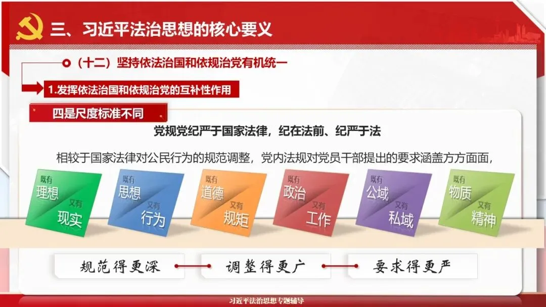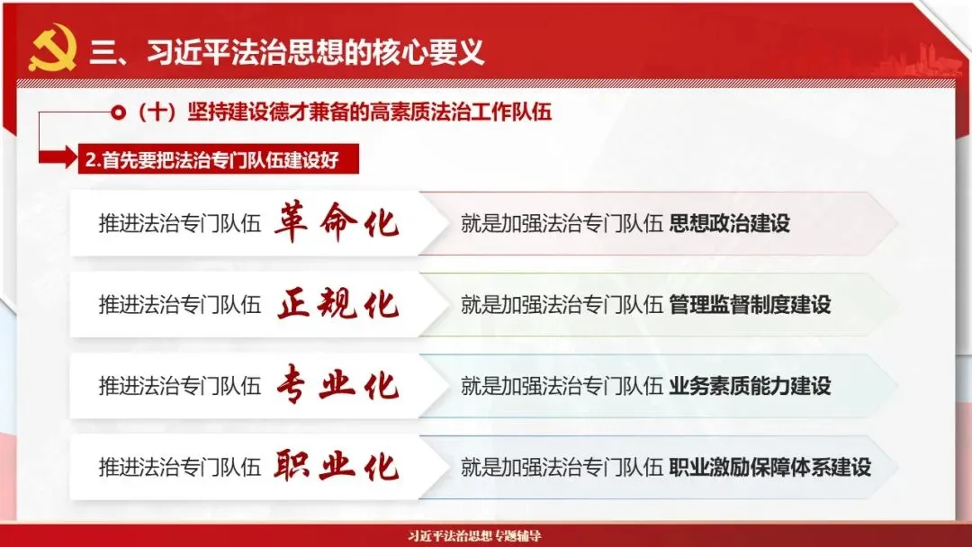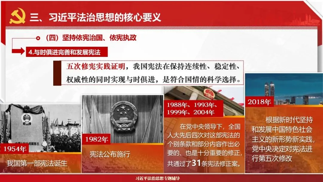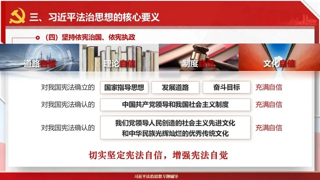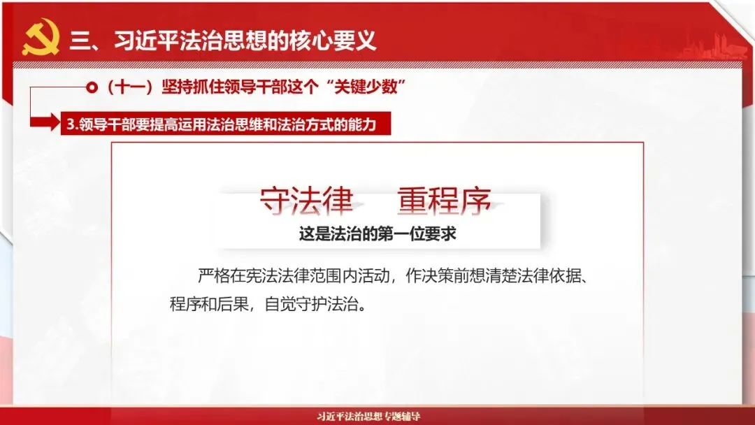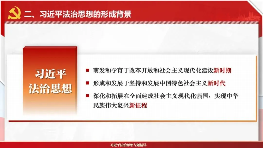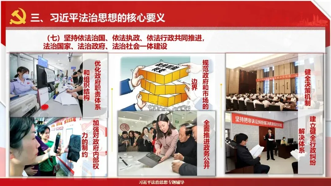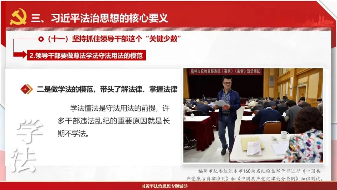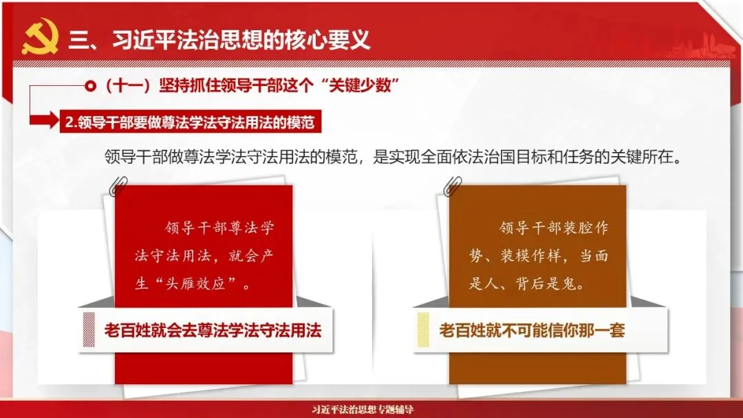 2026课程体系和教学大纲系列:法治思想辅导PPT,讲稿核心要义聚焦纲要“12个坚持”,融入新旧解读,引申成就、背景、实践,大量正反案例,充分增强讲稿生动性,已多次核实修正,确保权威引用。PPT版面设计风格采用大量高清图片、视频,结合图表运用,清晰呈现要点【版权声明】本PPT版设及讲稿已申请知识版权登记,提醒警示!交流认准标注原创及时持续更新、放心使用,其他渠道获取无版权必追究!篇幅部分展示,更多思政课程教学大纲系列、思想、论述、能力、本领类以及条例规定等辅导课件,及时更新。