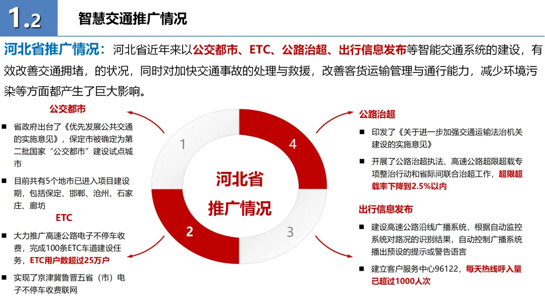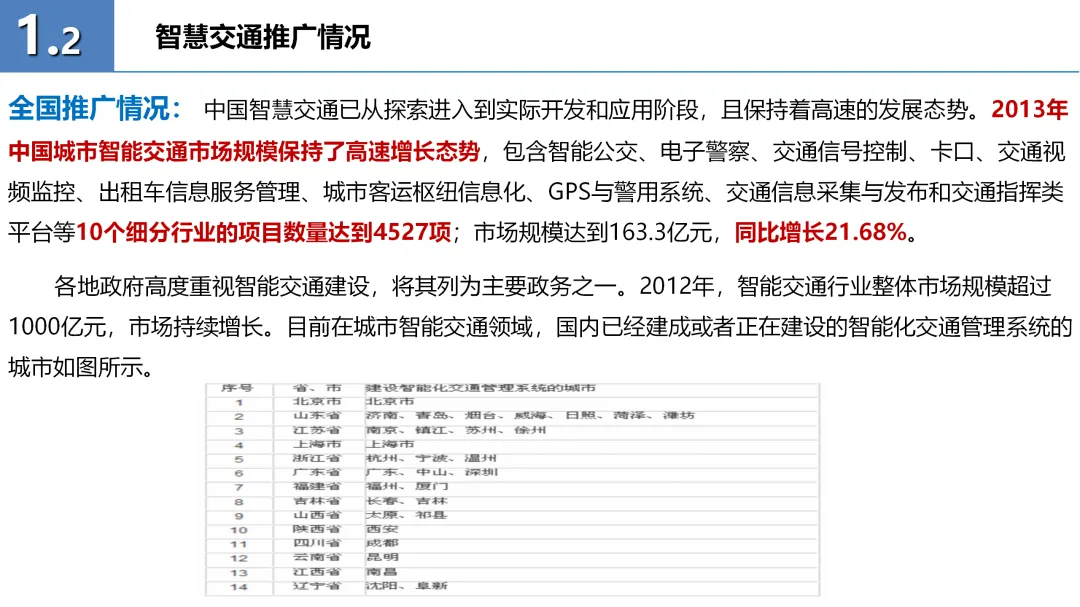 本方案详细阐述了智慧交通的整体解决方案,旨在通过集成先进的信息技术,提升交通系统的智能化水平。方案首先明确了智慧交通的概念,即在智能交通基础上融入物联网、云计算、大数据等技术,提供实时交通信息服务。随后,介绍了智慧交通在全国及重点城市的推广情况,展示了其广阔的市场前景。