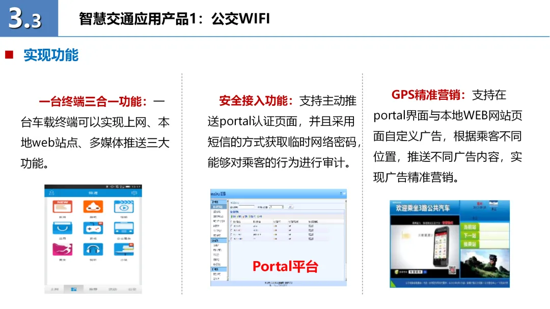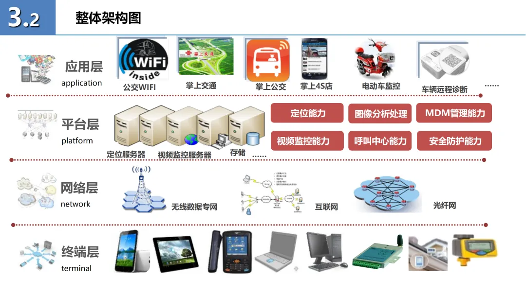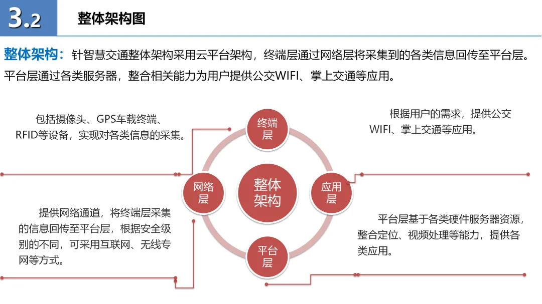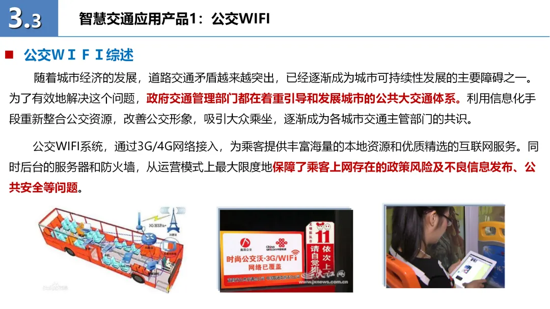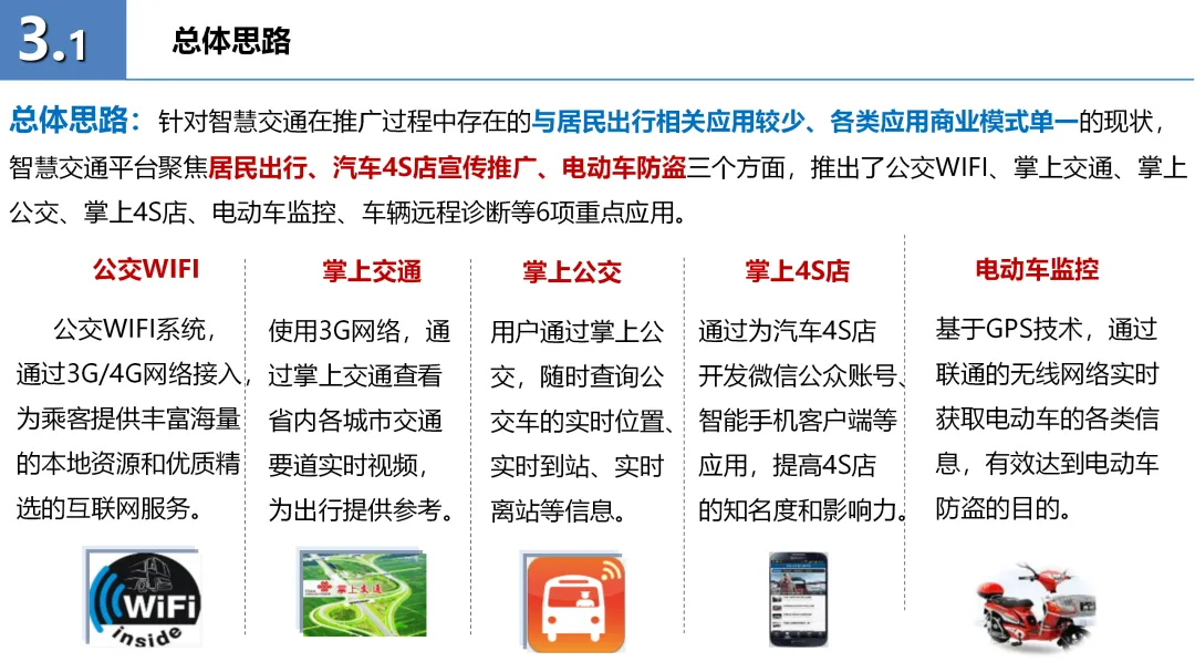 方案的核心部分包括智慧交通平台的总体架构和六大应用产品:公交WIFI、掌上交通、掌上公交、掌上4S店、电动车监控及车辆远程诊断。这些产品通过无线数据专网、定位服务器等基础设施,实现了交通信息的实时采集、处理与发布,有效提升了公众出行的便捷性和安全性。