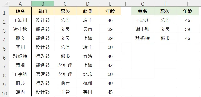 - A:E 列是完整信息:姓名、部门、职务、籍贯、年龄