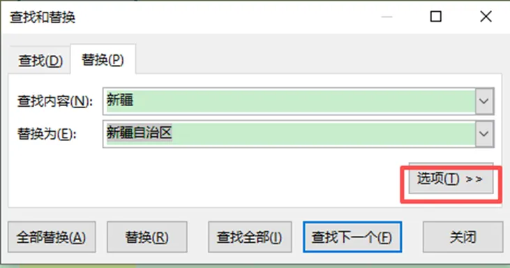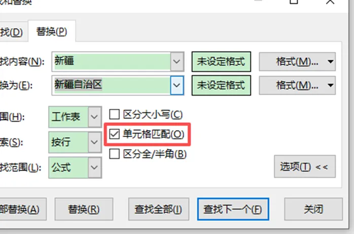 查找内容填 “新疆”,替换为填 “新疆自治区”,点击全部替换精准锁定整单元格内容,只改目标内容,半个字都不瞎换。