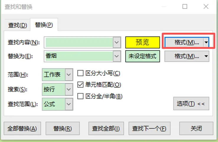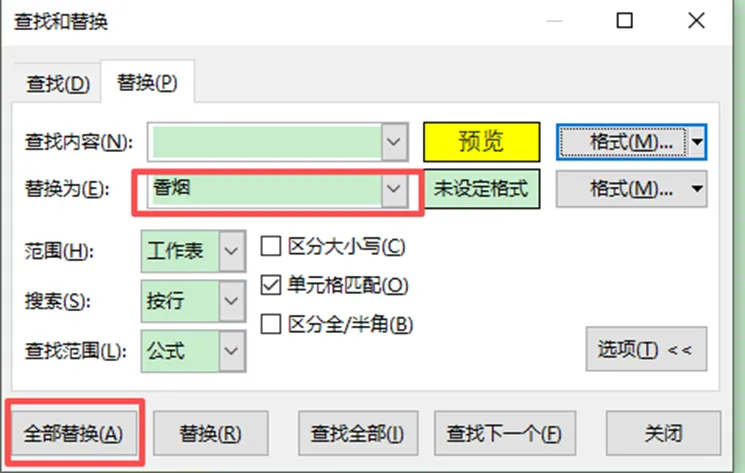 点击确定完成格式设置,替换为栏填写 “香烟”