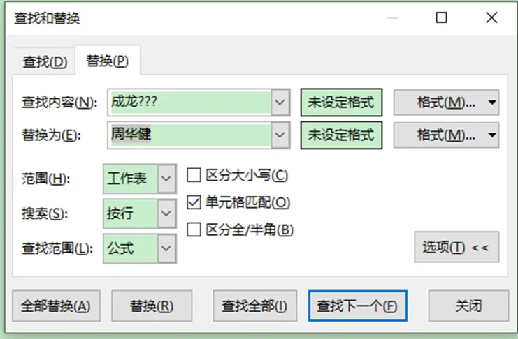 勾选「单元格匹配」,替换为栏填写 “周华健”