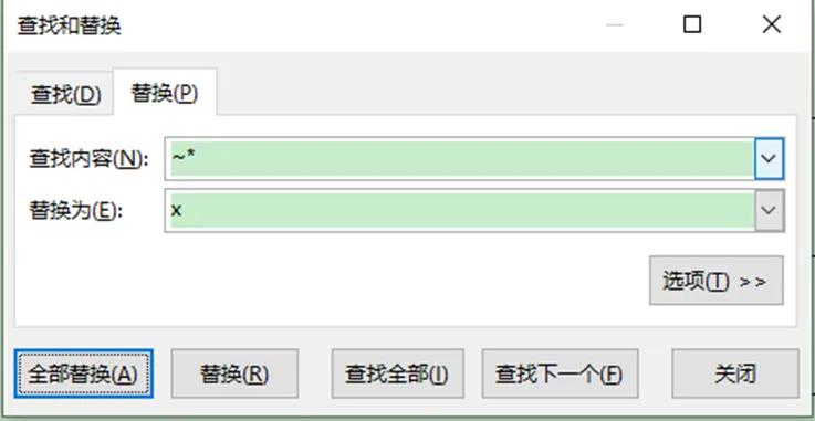 替换为栏填写 “X”,点击全部替换轻松精准替换真实符号,不被通配符干扰。