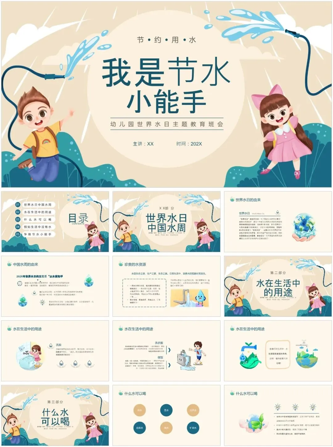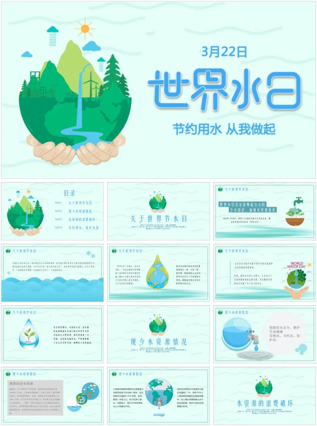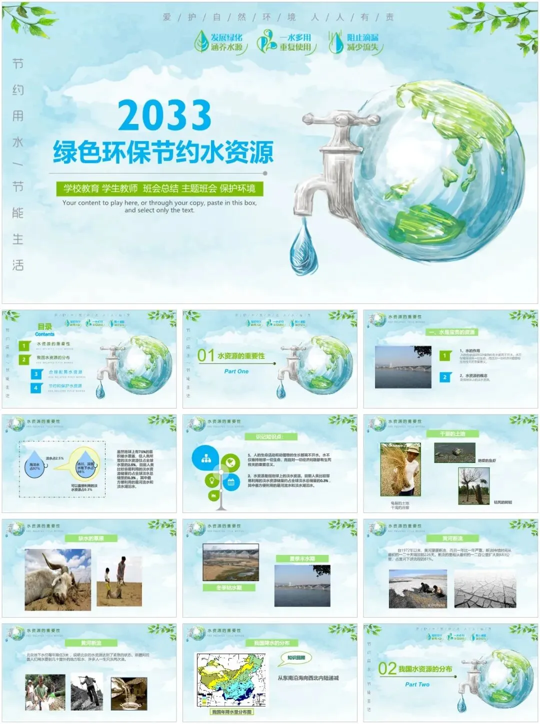 各位老师看过来!精心整理的40套节约用水主题班会PPT模板,核心亮点就是风格多样、不重样,省时又省力,彻底告别熬夜做课件的烦恼✨模板覆盖多种风格,适配不同年级和班会场景:有适配低年级的卡通可爱款,图文生动易懂;有适合中高年级的简洁大气款,重点突出、排版工整;还有趣味互动款、简约纪实款、清新插画款,每一款都独具特色。所有模板均围绕节水主题设计,涵盖水资源现状、节水小窍门、互动游戏、宣誓倡议等完整班会内容,素材、数据、案例齐全,打开就能编辑、替换班级信息。不管是日常班会、世界水日专项活动,还是节水宣传教育,40套多样模板按需挑选,轻松适配各种需求,省心又出片!以上,就是今天分享给大家的PPT模板部分内容预览图,完整内容大家领取后慢慢欣赏吧。- 精品PPT模板合集下载 -