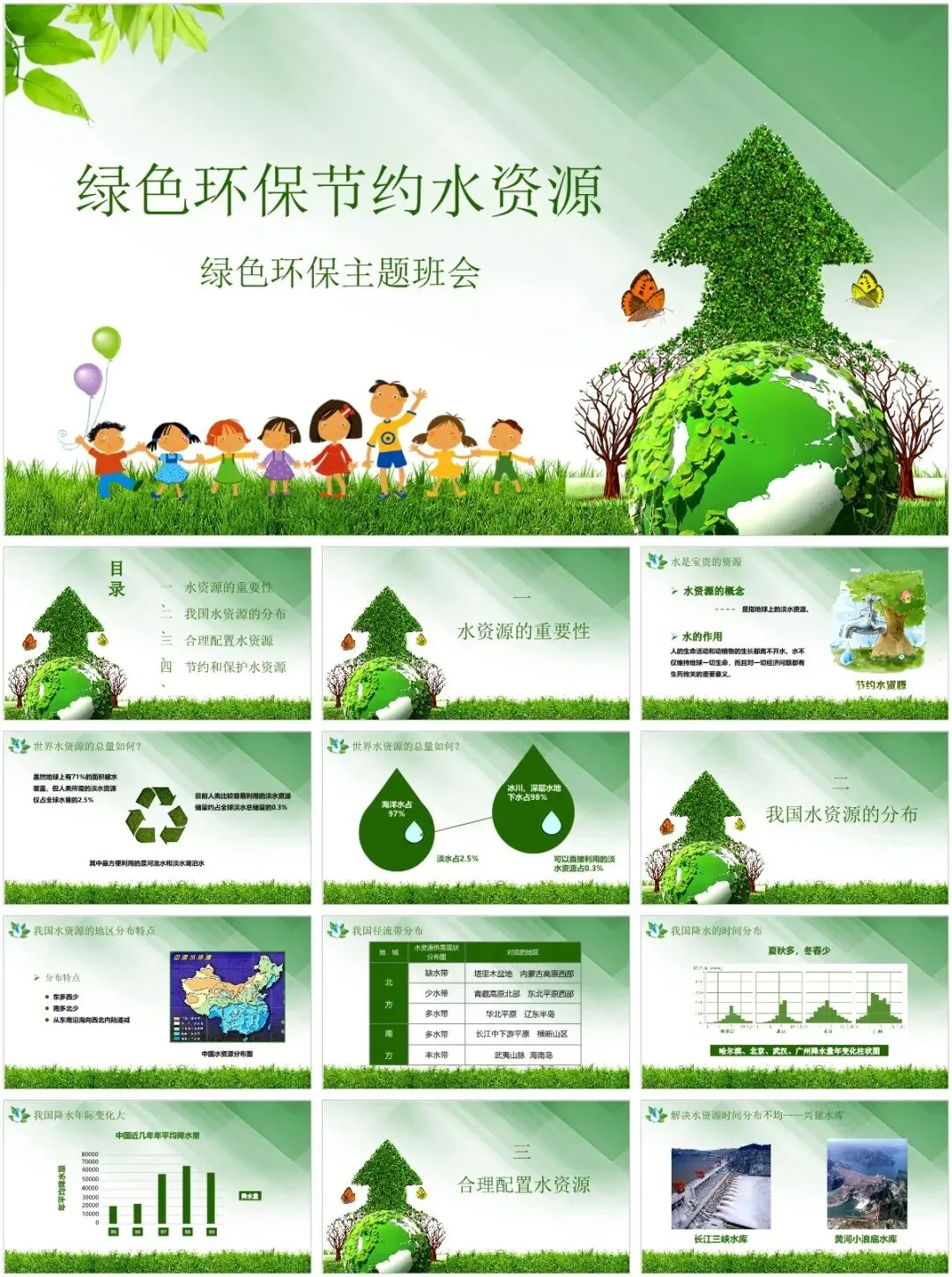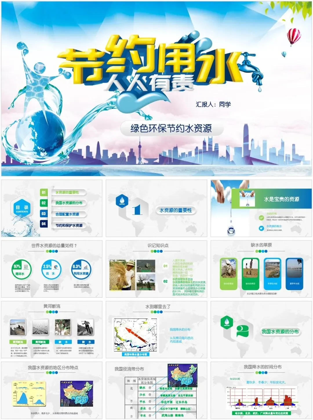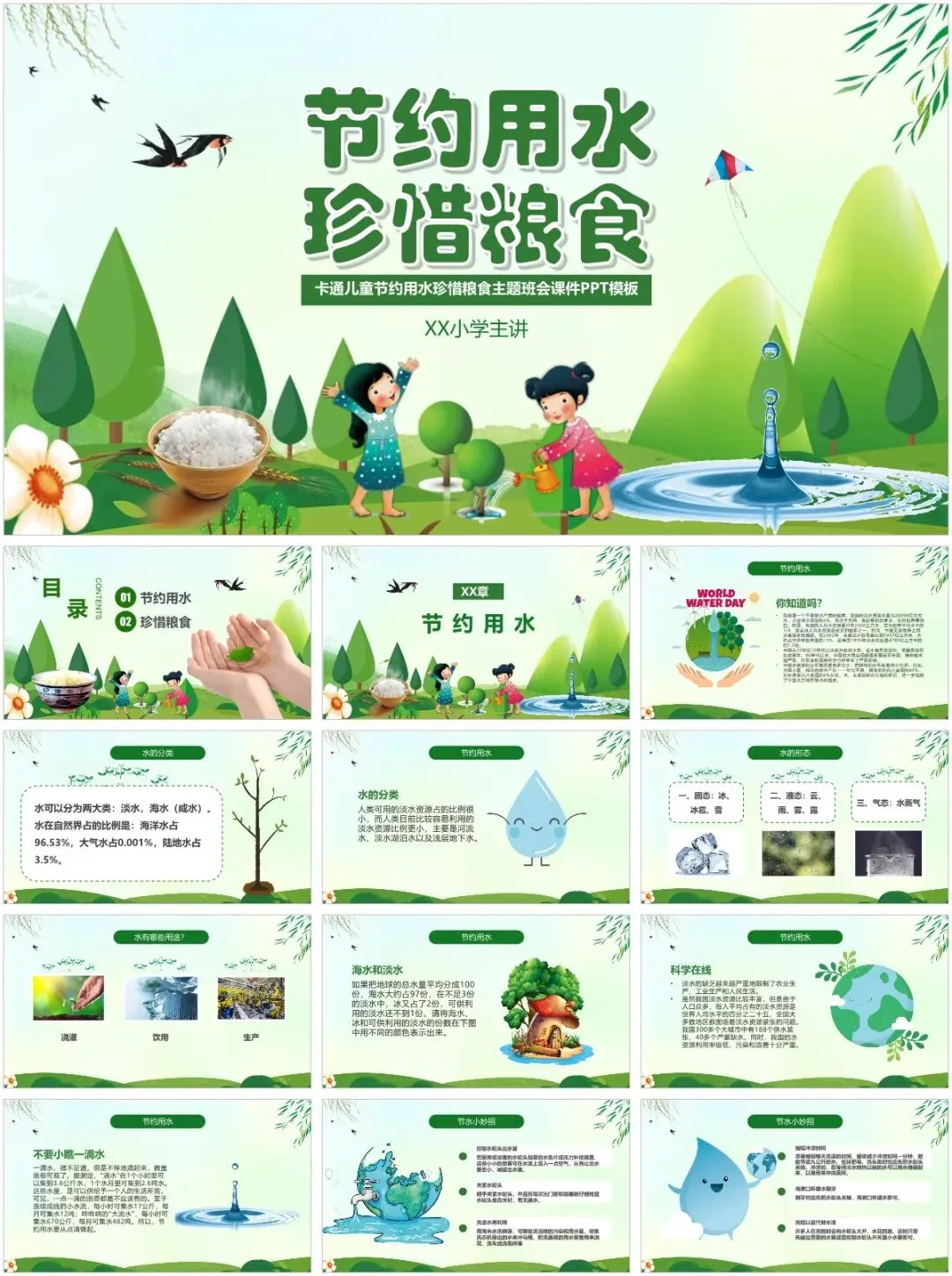 各位老师看过来!精心整理的40套节约用水主题班会PPT模板,核心亮点就是风格多样、不重样,省时又省力,彻底告别熬夜做课件的烦恼✨模板覆盖多种风格,适配不同年级和班会场景:有适配低年级的卡通可爱款,图文生动易懂;有适合中高年级的简洁大气款,重点突出、排版工整;还有趣味互动款、简约纪实款、清新插画款,每一款都独具特色。所有模板均围绕节水主题设计,涵盖水资源现状、节水小窍门、互动游戏、宣誓倡议等完整班会内容,素材、数据、案例齐全,打开就能编辑、替换班级信息。不管是日常班会、世界水日专项活动,还是节水宣传教育,40套多样模板按需挑选,轻松适配各种需求,省心又出片!以上,就是今天分享给大家的PPT模板部分内容预览图,完整内容大家领取后慢慢欣赏吧。- 精品PPT模板合集下载 -