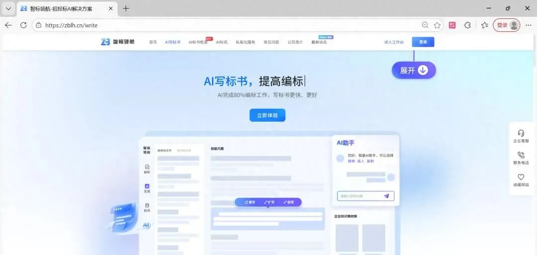 - AI 编标:上传文件→自动生成→微调定稿,全程 30 分钟,内容贴合招标要求、格式规范、数据精准