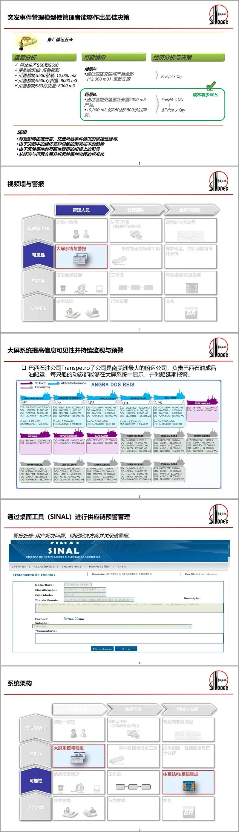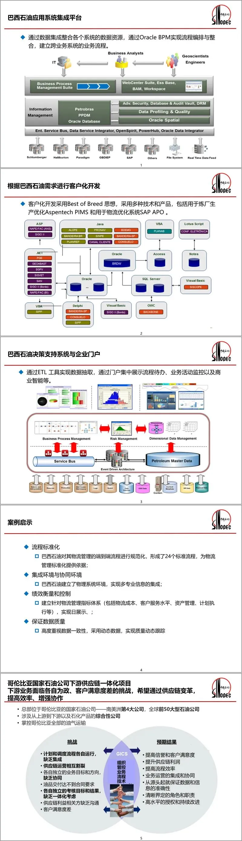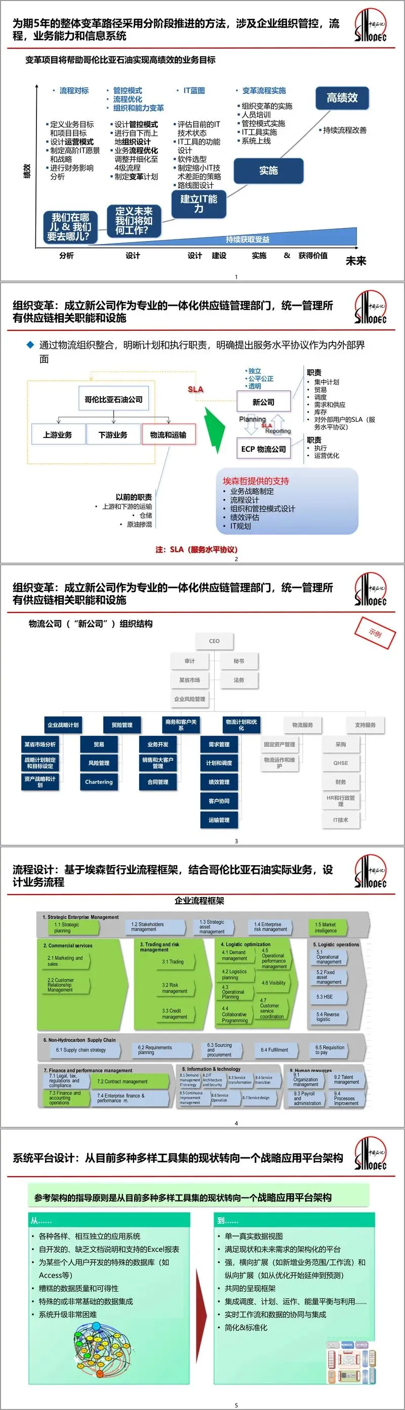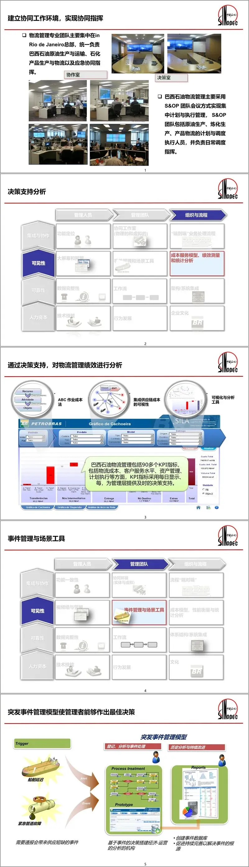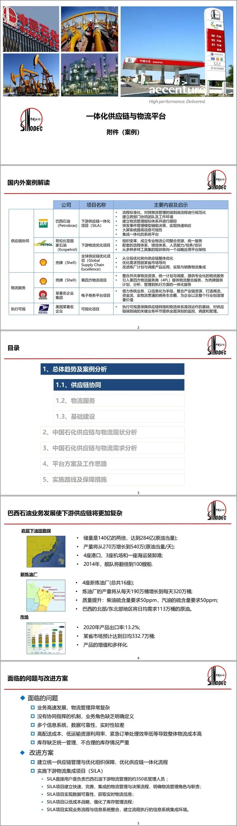 在国内外案例部分,涵盖供应链协同、物流服务、执行可视三类。巴西石油通过下游供应链一体化项目,实现流程标准化、建立协同团队与指标体系等;哥伦比亚国家石油进行组织变革,成立专业物流公司;壳牌从分段优化转向整体优化,还引入第四方物流服务商。某著名企业打造电子商务生态圈,美国某著名企业建立可视化应用体系,这些案例为中国石化提供了丰富借鉴。