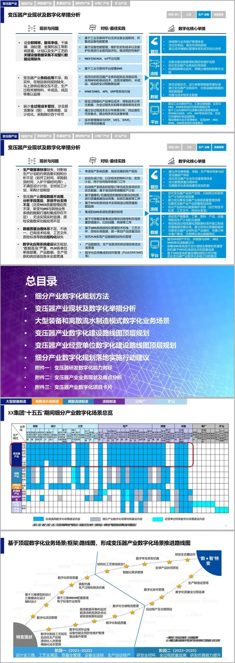 在核心战略上,方案以成本领先、效益优先、质量第一为导向,明确数字运营、数字基础、科技创新等七大战略目标,提出精益化、标准化、自动化等七大转型方向。针对变压器产业,梳理出研发设计、工艺、生产、质量等领域的核心痛点,如三维建模应用水平低、工艺数据结构化不足、设备数采率低等,并对标西门子、ABB 等行业标杆,制定了针对性数字化举措。