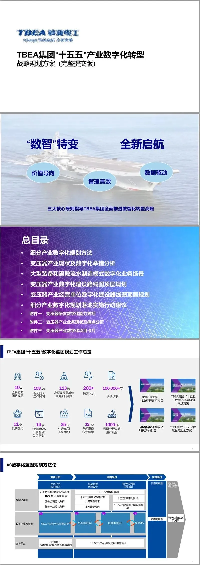 本规划聚焦 TBEA 集团 “十五五” 产业数字化转型,以 “数智特变,全新启航” 为愿景,遵循管理高效、价值导向、数据驱动三大核心原则,构建全面的数字化转型蓝图。规划通过 113 场高层调研、14 家经营单位研讨、25 个生产车间踏勘等深度调研,覆盖输变电、新能源、新材料等多个细分产业,形成了兼具针对性与可操作性的转型方案。