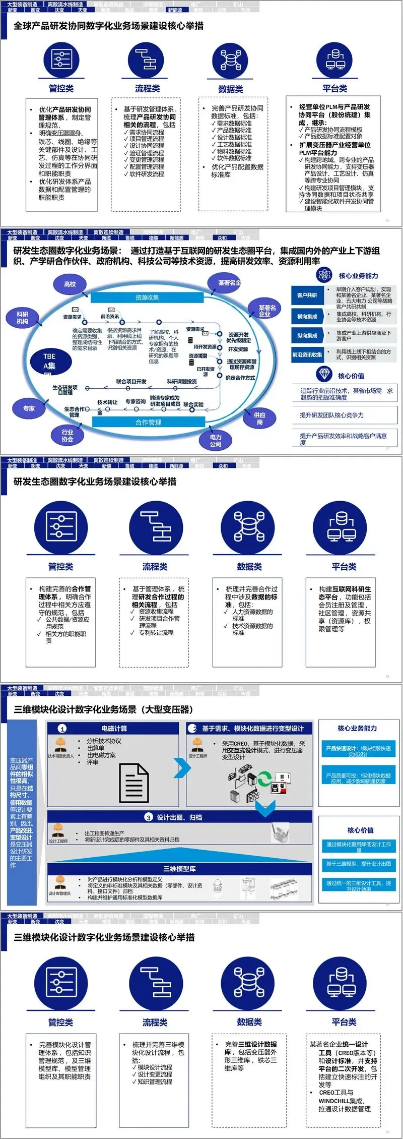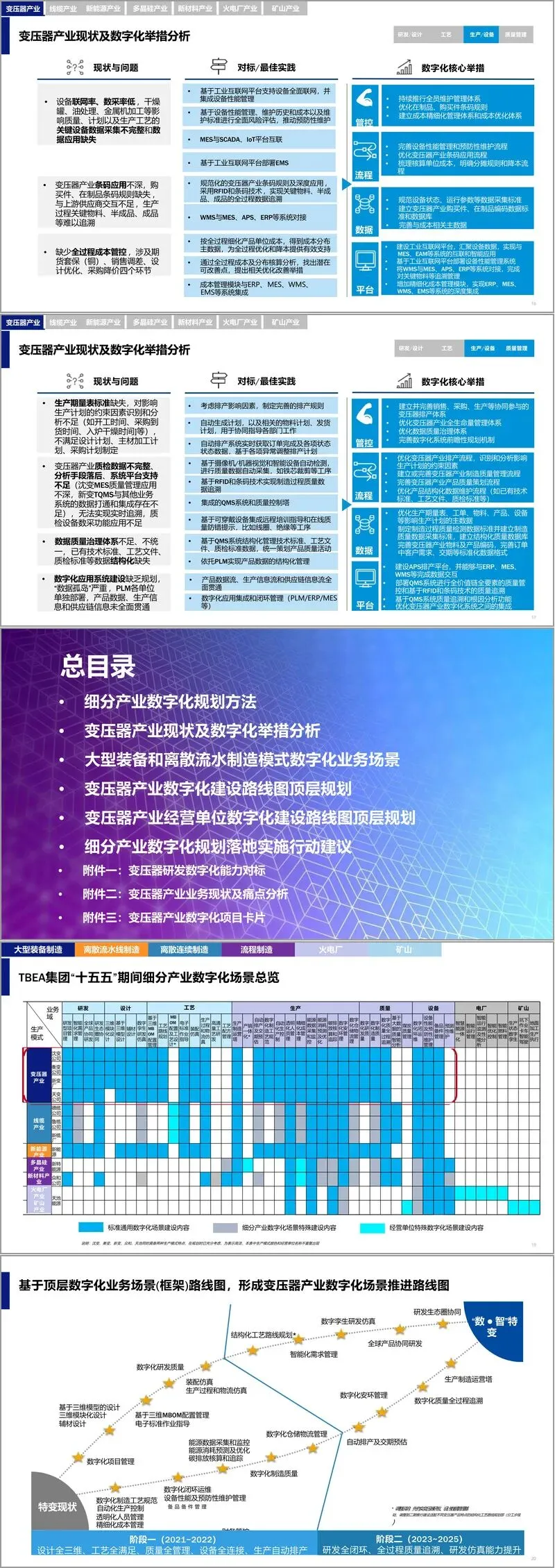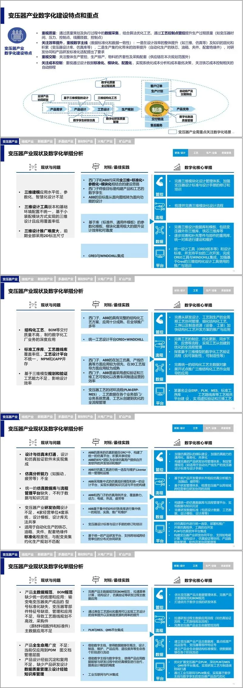 规划将集团细分产业划分为大型装备制造、离散流水线制造等六大模式,重点围绕变压器产业展开深度分析,梳理出研发设计、工艺管理、生产执行等七大业务域的核心痛点。研发端存在三维建模应用不足、设计与仿真未打通等问题;工艺端面临结构化工艺覆盖率低、数据贯通不畅等挑战;生产端则存在设备联网率低、质量追溯难等痛点。针对这些问题,规划对标西门子、ABB 等行业标杆,提出了全三维 + 标准化 + 参数化 + 模块化的建设思路。