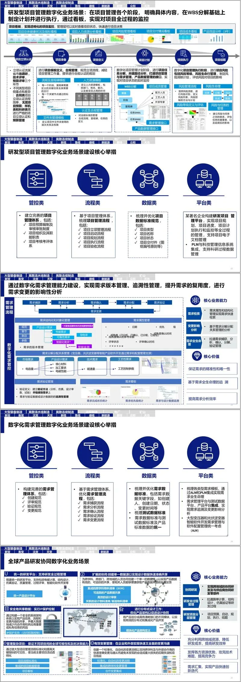 数字化场景规划是核心亮点,涵盖研发、工艺、生产、质量等多个维度。研发领域重点推进全球产品协同研发、数字孪生研发仿真等场景;工艺领域聚焦三维结构化工艺、装配仿真等应用;生产领域着力打造自动排产及交期预估、生产制造运营塔等数字化能力;质量领域构建全过程质量追溯体系。每个场景均明确了流程优化、数据标准、平台建设等核心举措,形成 “现状诊断 - 蓝图规划 - 实施路线” 的闭环方法论。