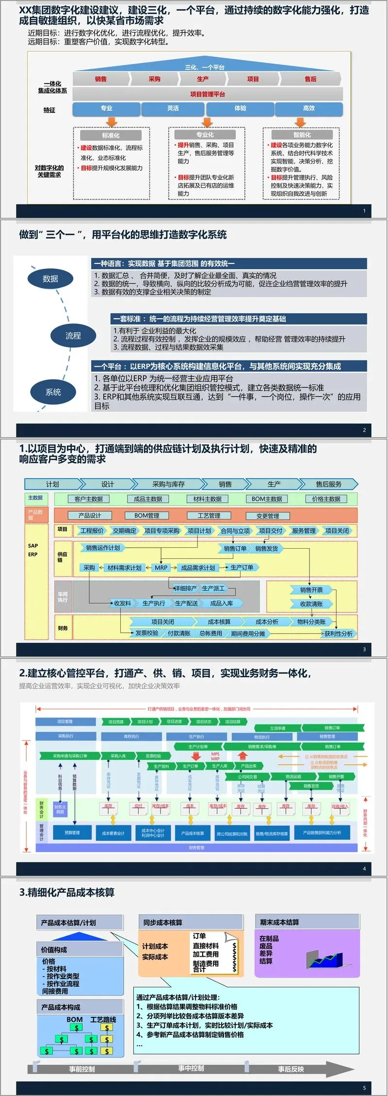 基于此,集团明确信息化建设目标,短期优化流程、提升效率,远期重塑客户价值、实现数字化转型。方案核心围绕 “三化、一个平台” 展开,通过标准化、专业化、智能化建设,以 ERP 为核心构建统一信息化平台,实现 “一种语言、一套标准、一个平台” 的管理目标,打通产供销、项目与财务的全业务链条。