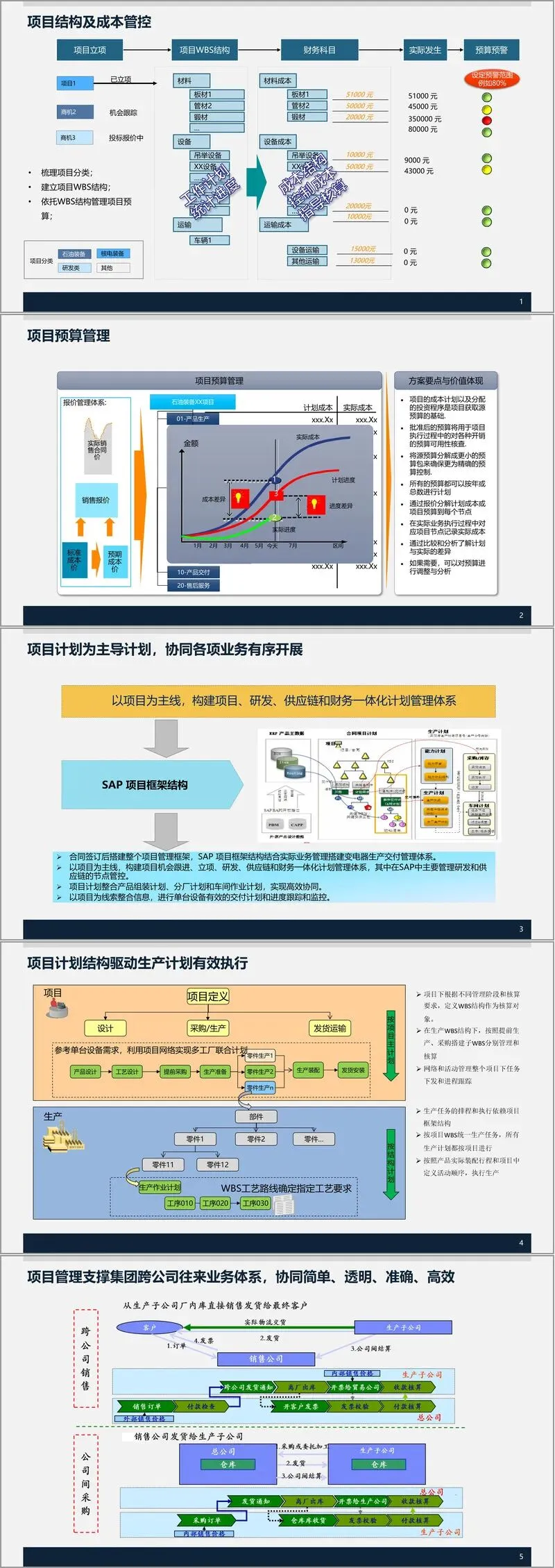 在整体架构上,方案涵盖支撑层、运营层、决策管理层,整合 IT 基础设施、业务系统与数据分析工具。具体业务方案中,项目管理以 WBS 结构为核心,实现预算管控、计划协同与成本核算一体化;销售管理构建从报价、合同签订到发货、回款的全流程管控体系,支持灵活定价与分批交付;生产管理建立滚动计划机制,通过 MRP 运算优化物料需求,结合条码技术实现生产过程追溯与高效管控;采购管理搭建从申请到付款的闭环流程,整合 SRM 系统提升供应商协同效率;库存管理依托条码与 ERP 系统,实现收发存全流程精细化管控;质量管理构建全流程体系,涵盖来料、生产过程、成品等多环节检验与追溯;设备管理实现资产全生命周期管控,优化维修流程与成本核算;财务管理建立矩阵式管理模式,实现业务财务一体化与多维度获利分析;人力资源管理整合组织、人事、考勤、薪酬等模块,提升人力资源管理效率。