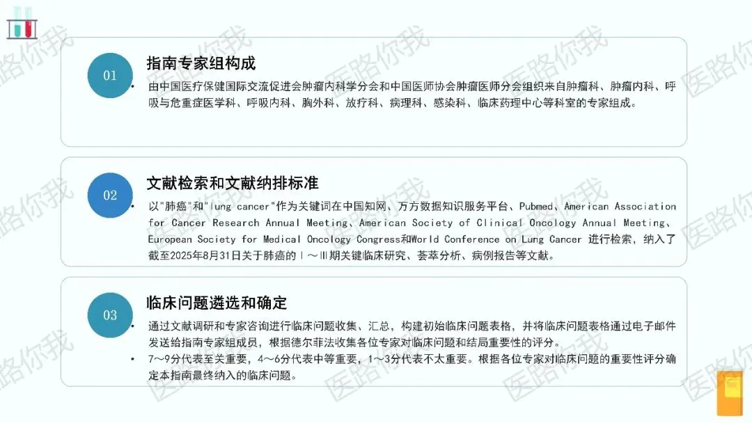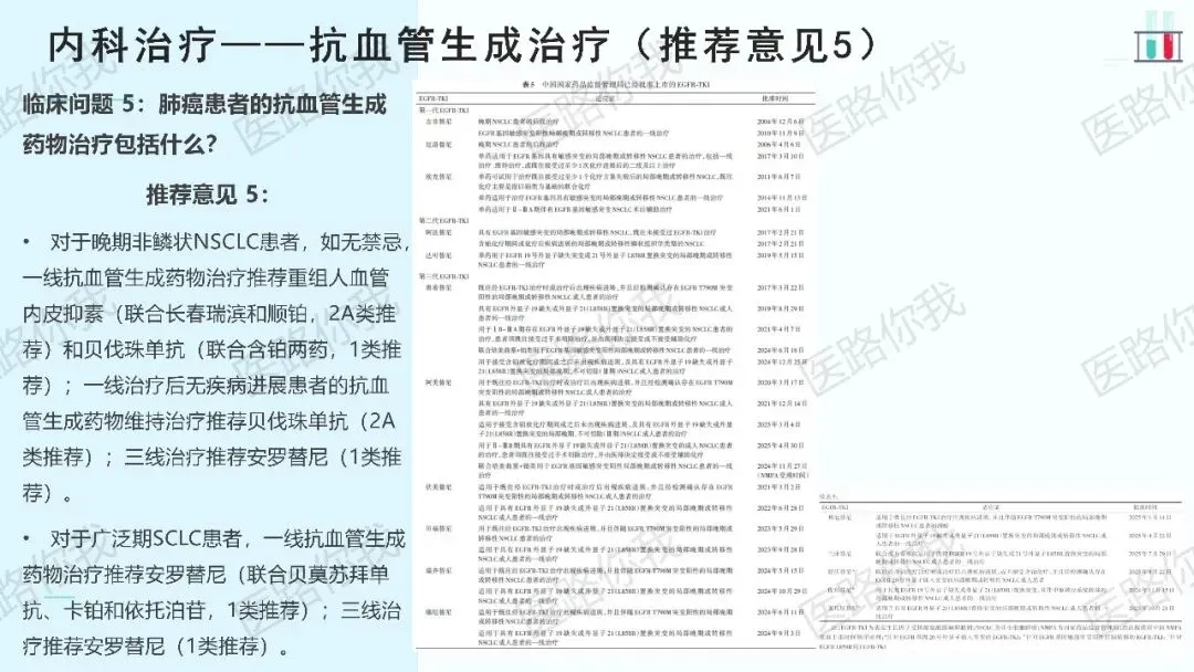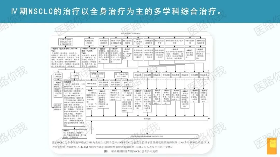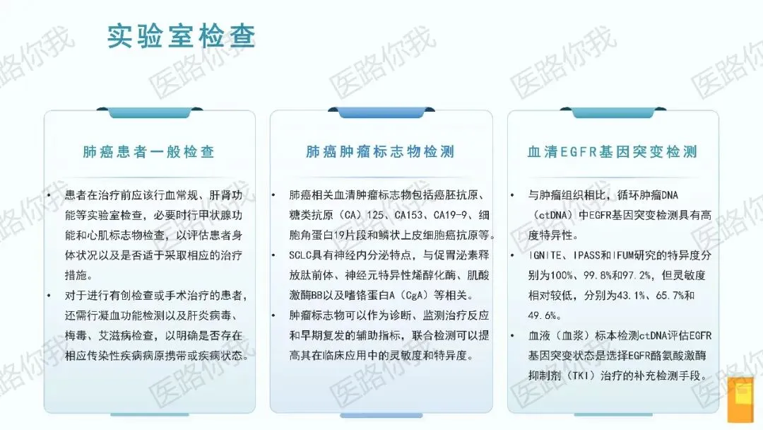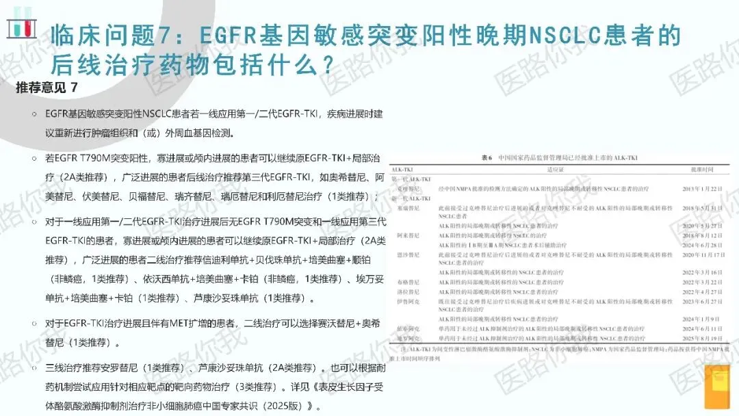 - 耐药后管理:强调再次活检或液体活检以明确耐药机制。T790M阳性者,后线首选第三代TKI;无T790M或三代TKI耐药者,可根据耐药机制选择相应靶向药(如MET扩增者选用赛沃替尼+奥希替尼)或进入免疫联合化疗方案。