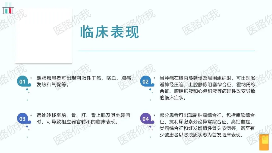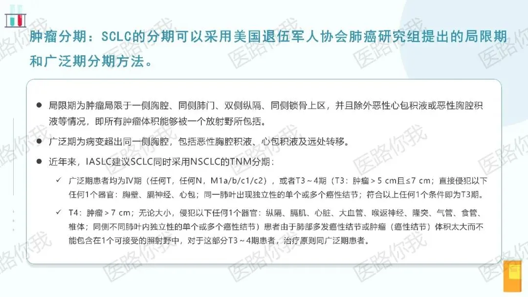 - SCLC分期:可同时采用传统的局限期/广泛期分期法,以及IASLC的TNM分期。广泛期SCLC在TNM分期中对应为Ⅳ期。