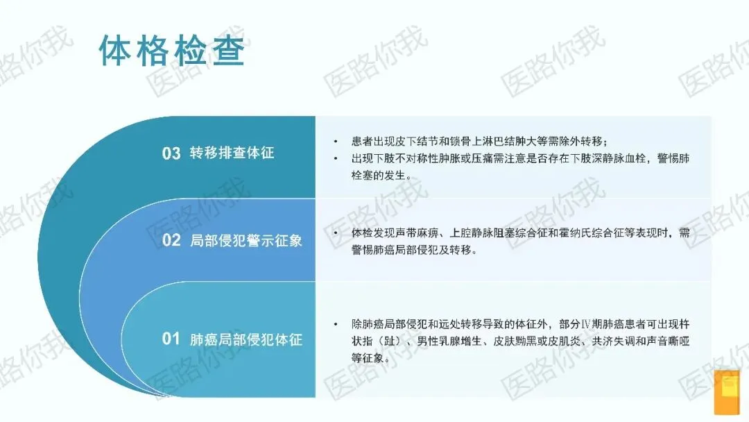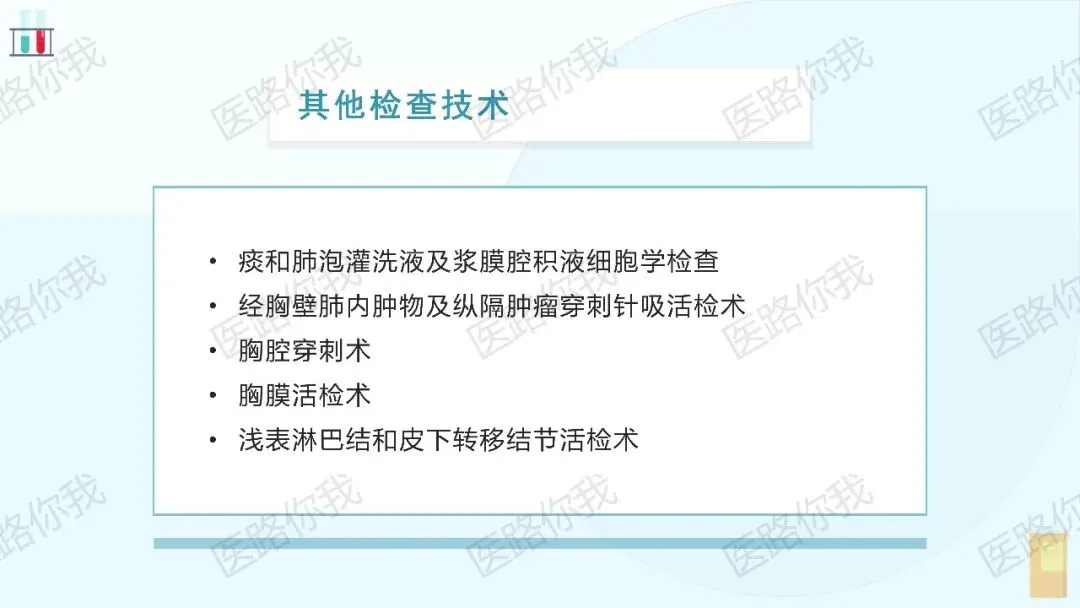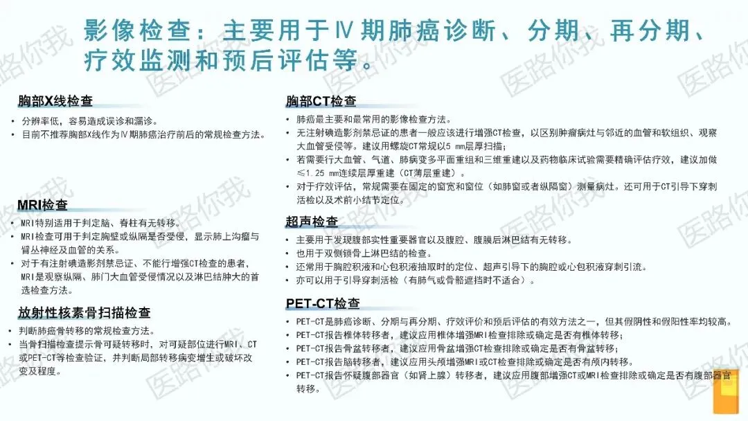 - 影像学检查:增强胸部CT是肺癌最主要和最常用的影像学检查方法。PET-CT在诊断、分期、再分期及疗效评价中具有重要价值,但需注意其假阳性/假阴性问题,并建议对可疑转移灶(如骨、脑、肾上腺)进行MRI或增强CT等进一步验证。