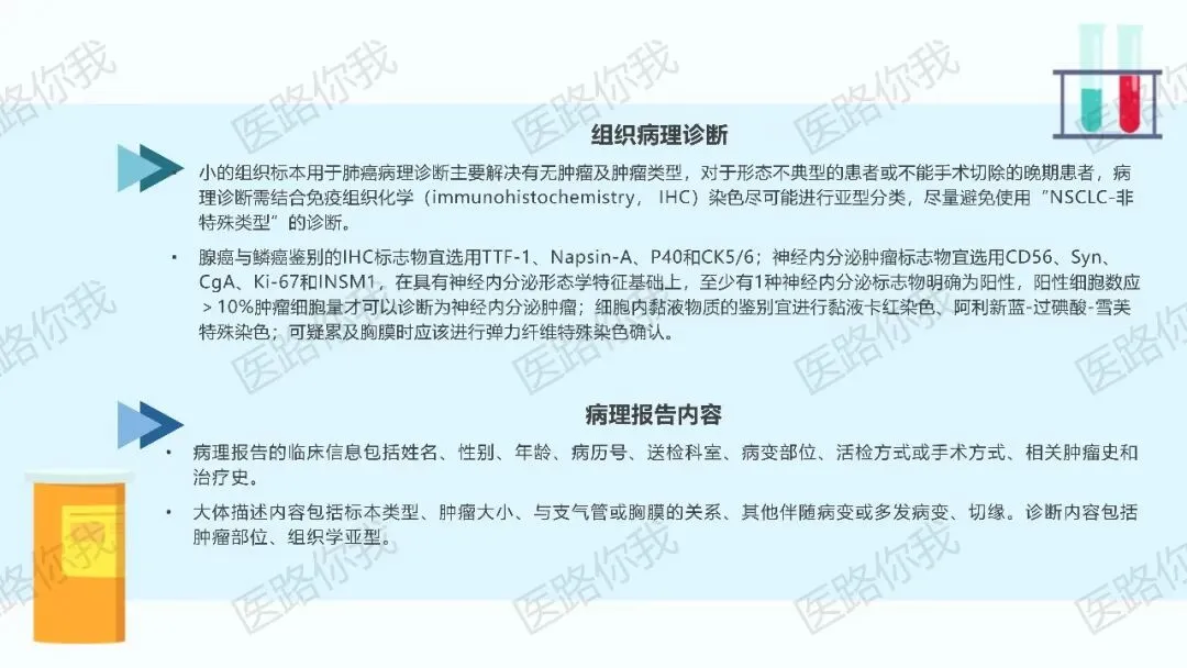 病理诊断金标准:必须明确组织学亚型(如腺癌、鳞癌),避免使用“NSCLC-非特殊类型”的笼统诊断。免疫组化(IHC)是鉴别亚型的关键技术。