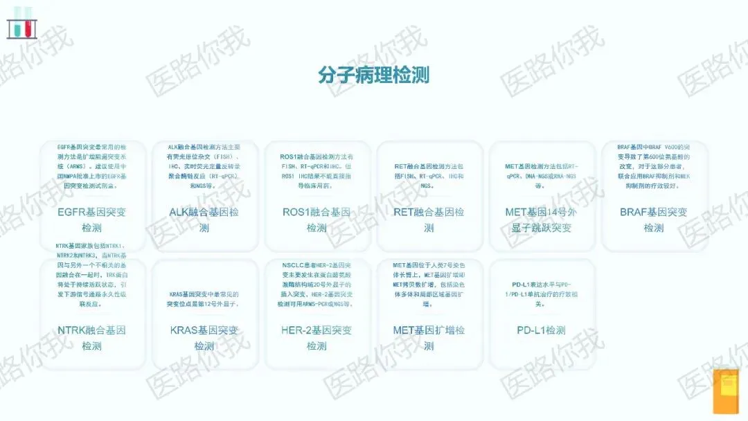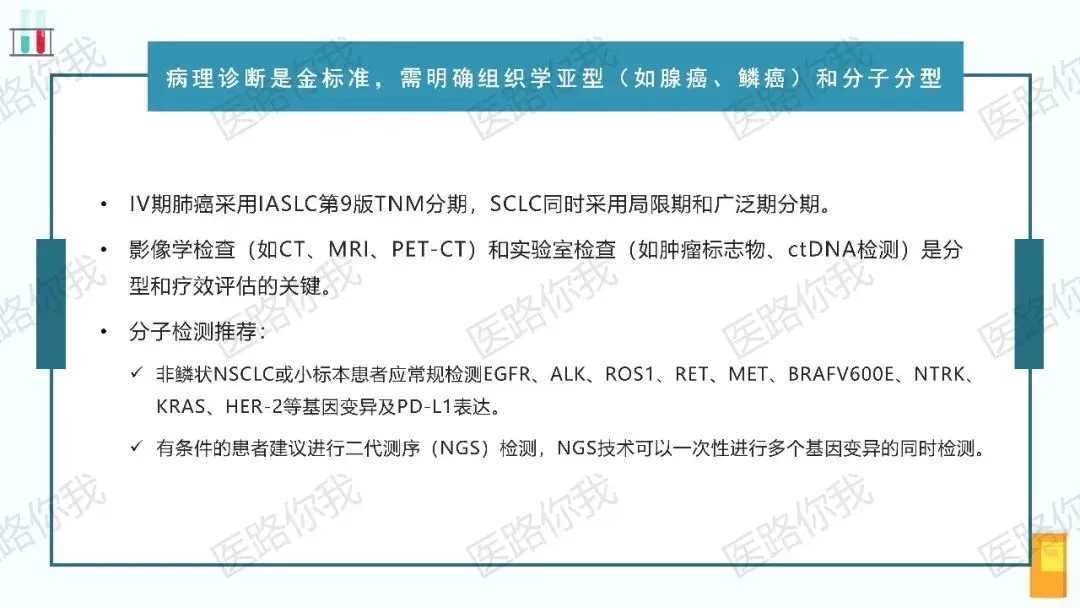 全面分子检测:对于Ⅳ期非鳞状NSCLC、含腺癌成分的肺癌、小标本或不吸烟的鳞癌患者,应常规检测EGFR、ALK、ROS1、RET、MET(14号外显子跳跃突变及扩增)、BRAF V600E、NTRK、KRAS、HER-2 等驱动基因变异,并评估 PD-L1蛋白表达水平。