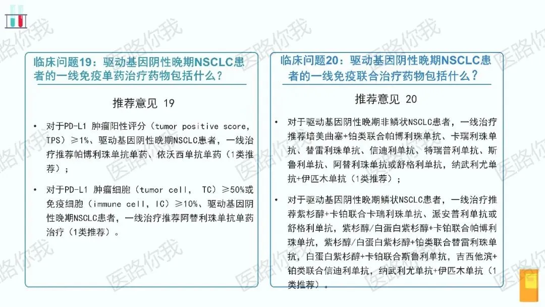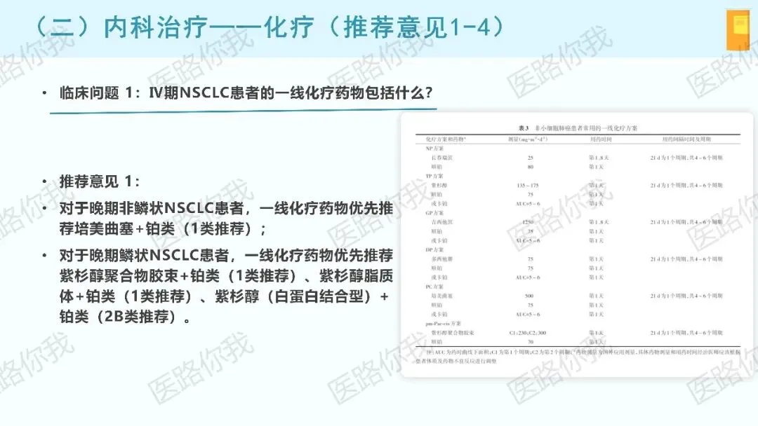 - 无论PD-L1表达水平:免疫联合化疗是更普遍和优选的策略。指南详细列出了针对非鳞癌(培美曲塞+铂类为基础)和鳞癌(紫杉醇/吉西他滨+铂类为基础)的多种联合方案。