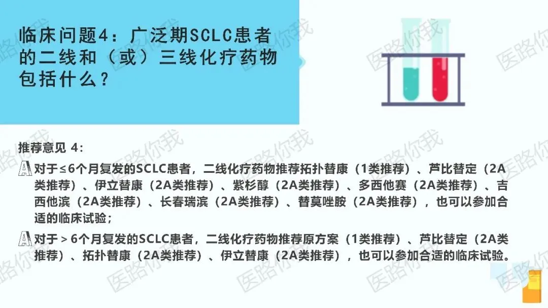 - 二线治疗:根据复发时间(≤6个月 vs >6个月)选择不同药物,拓扑替康(1类推荐)、芦比替定(2A类推荐)等是主要选择。