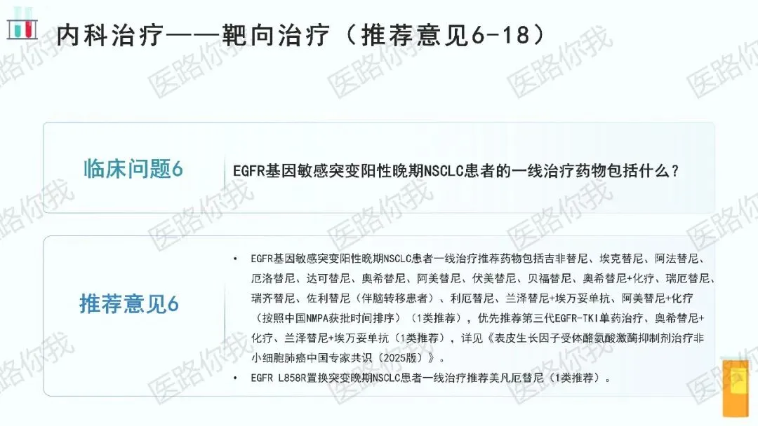 - 一线首选:第三代EGFR-TKI单药(如奥希替尼)、奥希替尼+化疗、或兰泽替尼+埃万妥单抗。