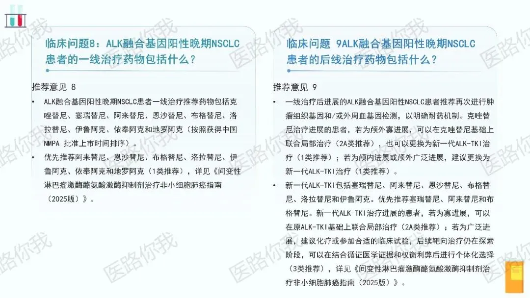 - 一线首选:新一代ALK-TKI(如阿来替尼、恩沙替尼、布格替尼、洛拉替尼、伊鲁阿克等)。