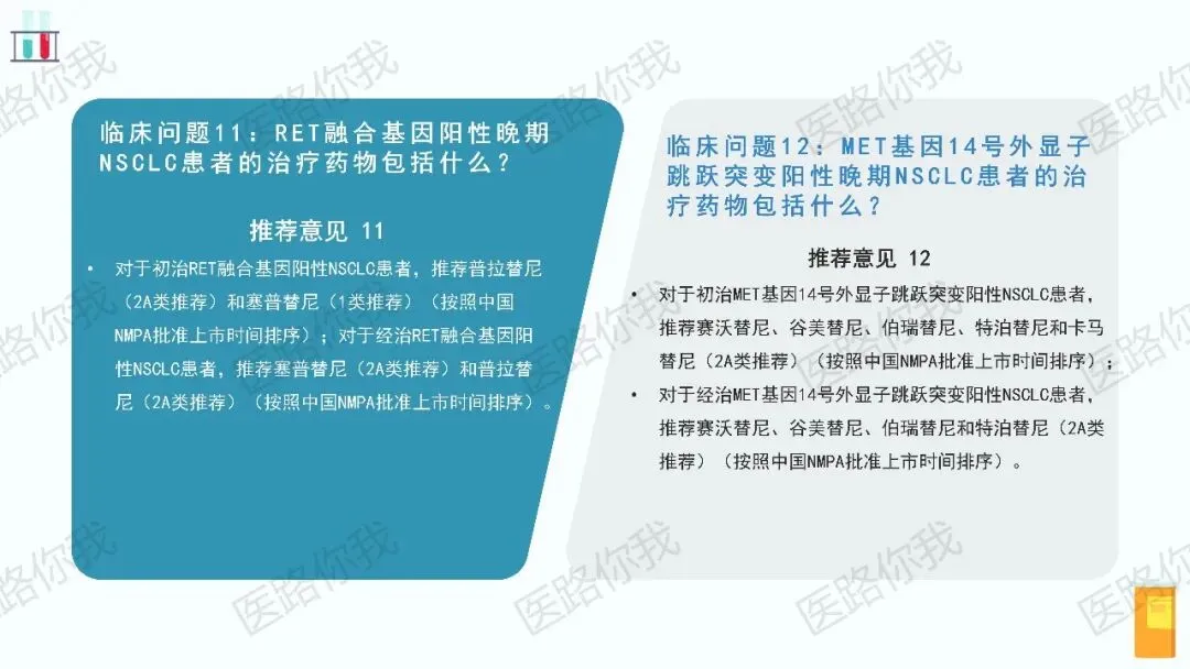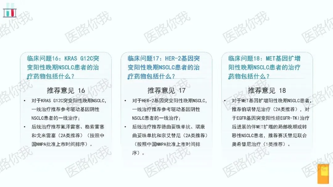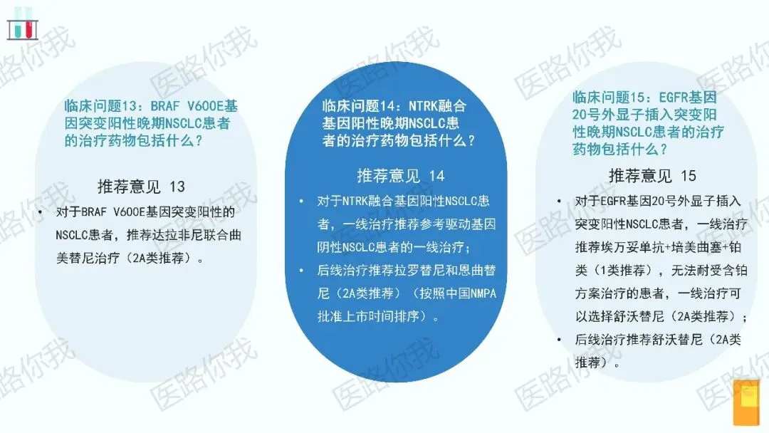 ROS1、RET、MET ex14跳突、BRAF V600E、NTRK、KRAS G12C、HER-2、EGFR 20ins 等靶点均给出了明确的药物推荐,体现了对罕见突变患者的全面覆盖。