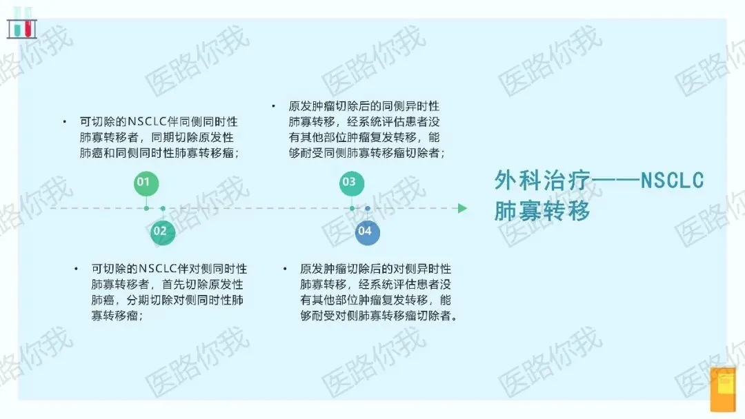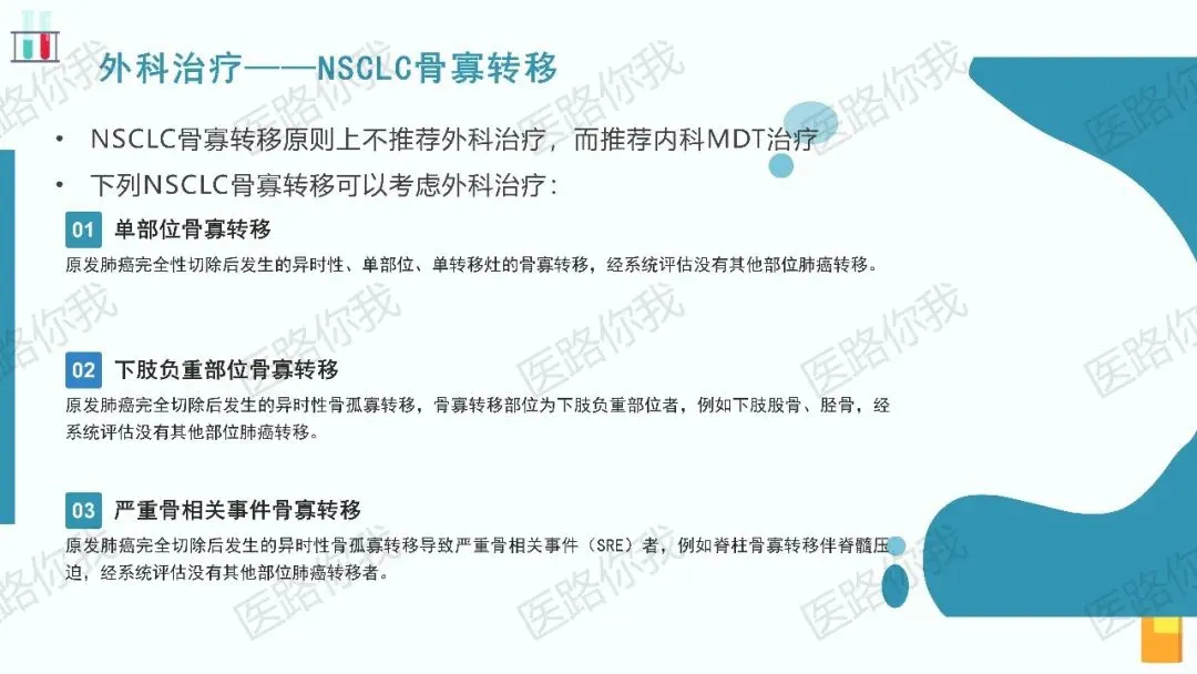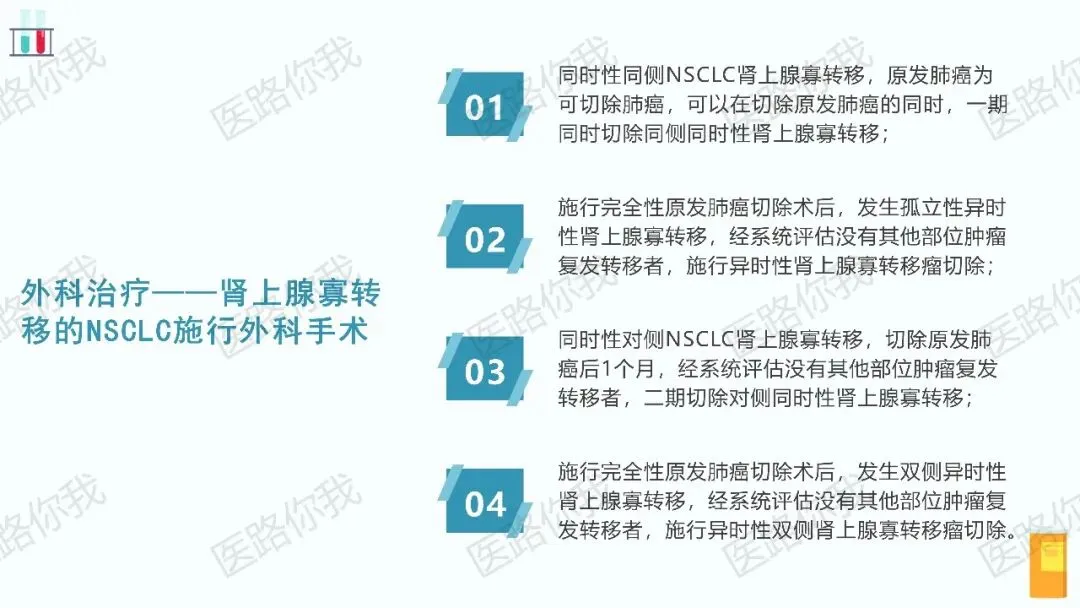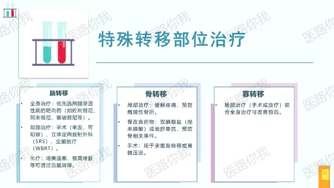 对于出现寡转移(如脑、肾上腺、骨、肺)的患者,在全身治疗有效的前提下,积极的局部根治性治疗(手术或放疗)可能带来更好的长期生存。指南对外科手术和放射治疗的适应症进行了详细阐述。