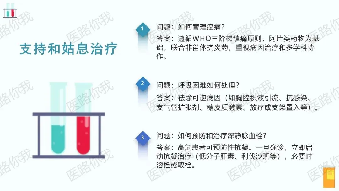 指南同样重视患者的生活质量,对癌痛管理(遵循WHO三阶梯原则)、呼吸困难处理、深静脉血栓预防与治疗等支持治疗问题给出了明确指导。