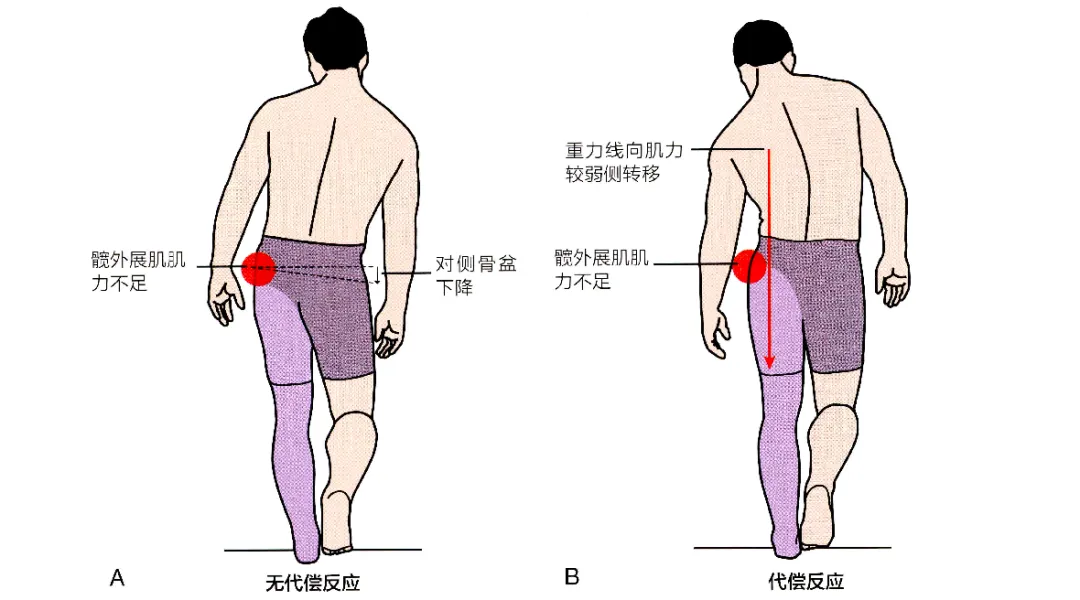 ·无代偿反应。支撑(左)腿的髋外展,肌无法产生足够的力量来保持骨盆水平,因此,骨盆(通常是躯上)失控地偏向另一侧(右侧)。这也被称为Trendelenburg征阳性(A)