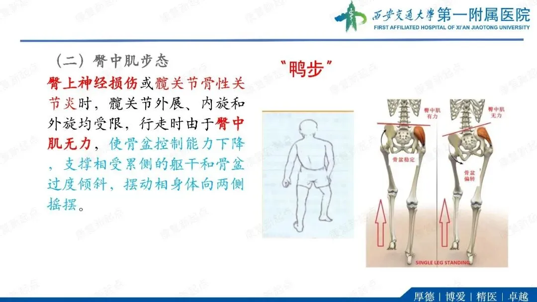 ·可能继发于吉兰-巴雷综合征,肌营养不良、脊髓灰质炎、髋部疼痛、髋关节炎、肥胖症或任何会降低髋外展肌肌力的病变。