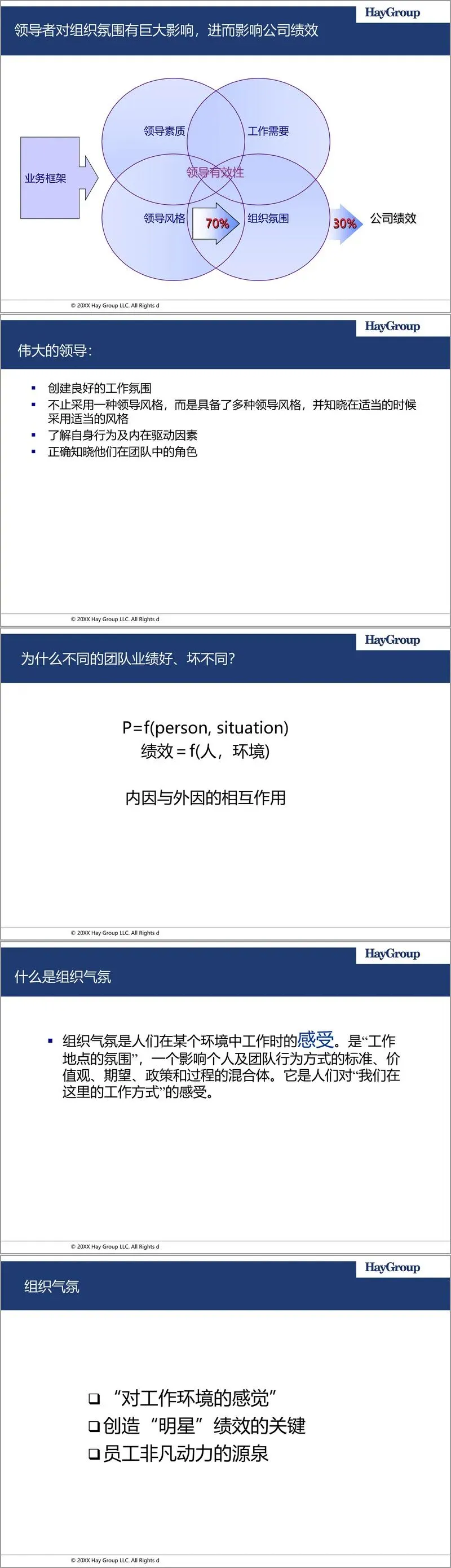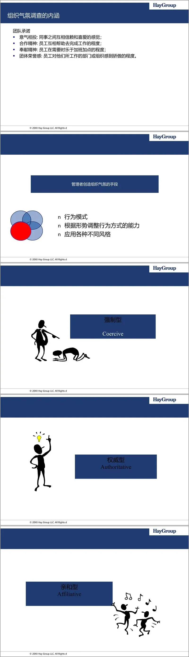 领导者通过其行为模式塑造组织气氛,而行为模式又体现在其对不同领导风格的掌握与运用上。文档细致剖析了六种典型领导风格:强制型(要求立即服从)、权威型(指明长远方向)、亲和型(建立和谐关系)、民主型(激发团队承诺与参与)、领跑型(以身作则,追求高标准)以及辅导型(促进员工长远发展)。有效的领导者并非固守单一风格,而是如同交响乐指挥,懂得在适当情境下运用恰当的风格组合。