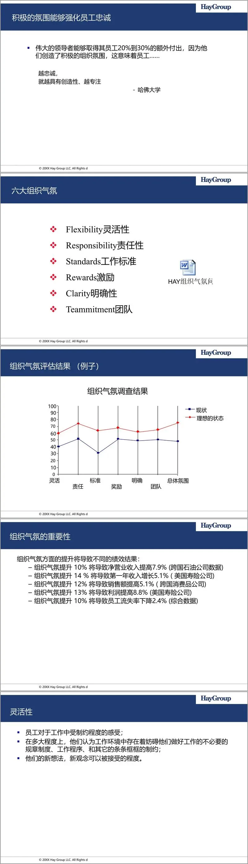 绩效的本质,是个人与环境相互作用的结果,即P=f(人,环境)。这其中,“组织气氛”扮演了至关重要的中介角色。它被定义为员工在特定环境中工作时的感受,是影响行为方式的标准、价值观、期望、政策和过程的混合体,堪称员工非凡动力的源泉和创造“明星”绩效的关键。哈佛大学的研究指出,伟大的领导者能赢得员工20%到30%的额外付出,正源于其营造的积极组织氛围所强化的员工忠诚度。HayGroup将组织气氛解构为六个可衡量维度:灵活性(减少官僚主义,鼓励创新)、责任性(赋予授权,鼓励合理冒险)、工作标准(强调绩效改善,追求卓越)、激励(基于绩效的奖励与认可)、明确性(清晰的使命方向与岗位职责)以及团队承诺(团队自豪感与合作奉献精神)。实证研究表明,组织气氛的微小提升都能带来显著的财务回报,例如提升10%可导致净营业收入提高7.9%。