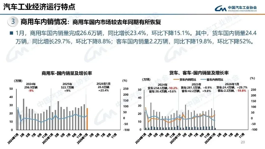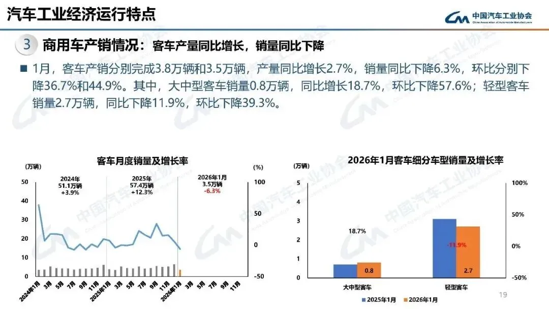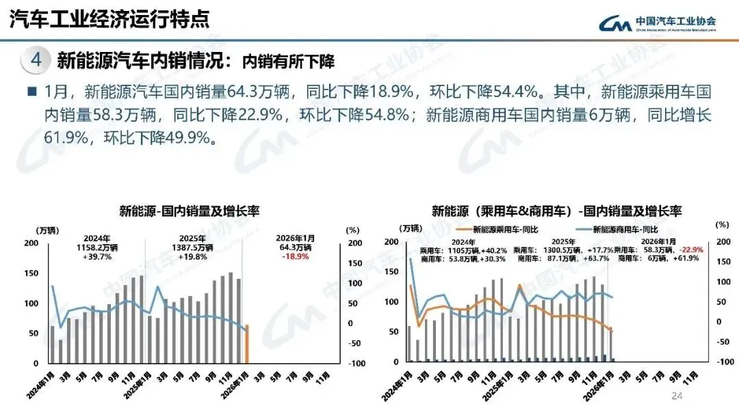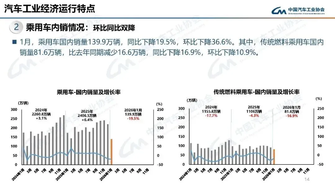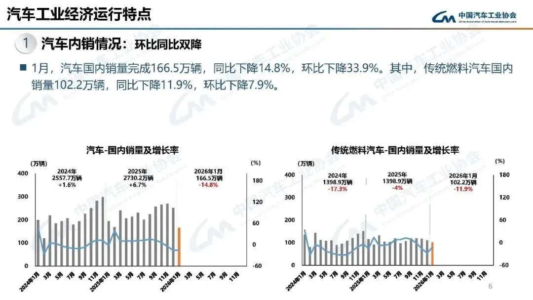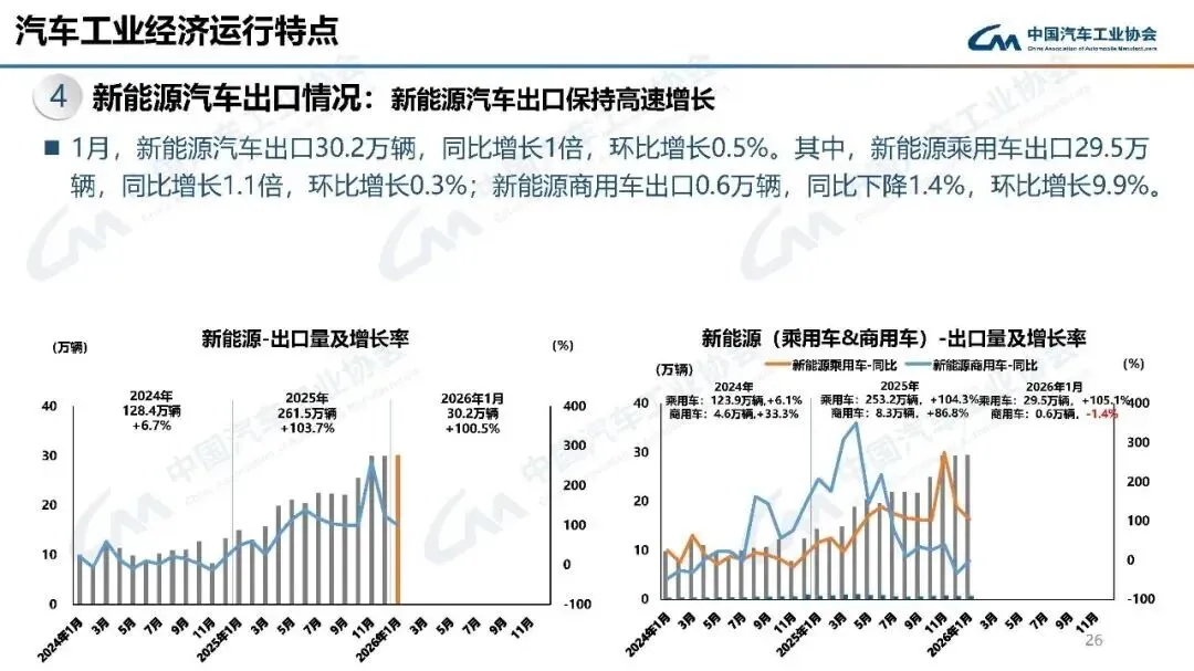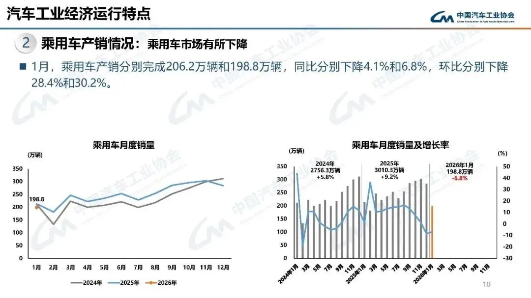 2026年1月,汽车产销分别完成245万辆和234.6万辆,产量同比增长0.01%,销量同比下降3.2%,环比分别下降25.7%和28.3%。