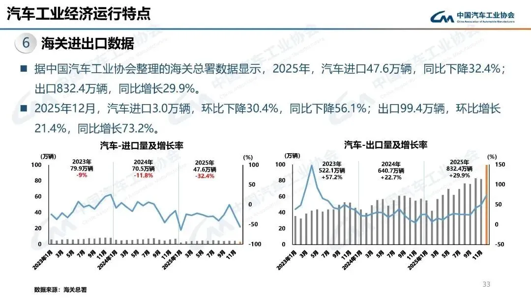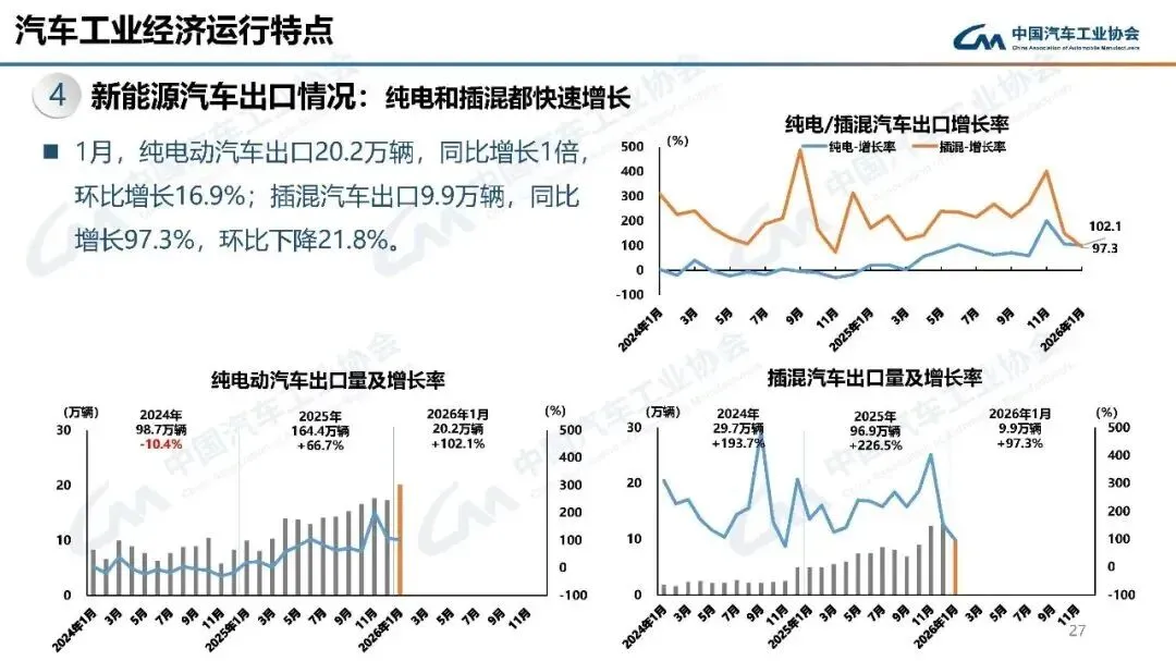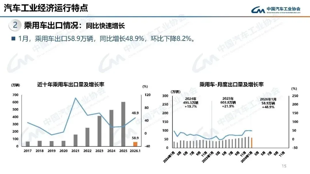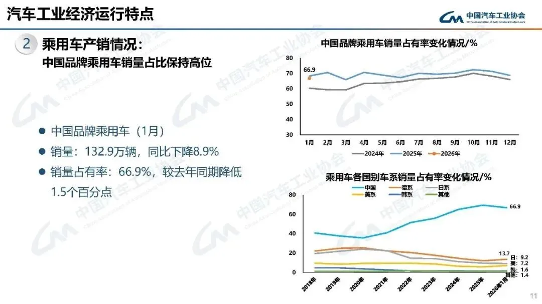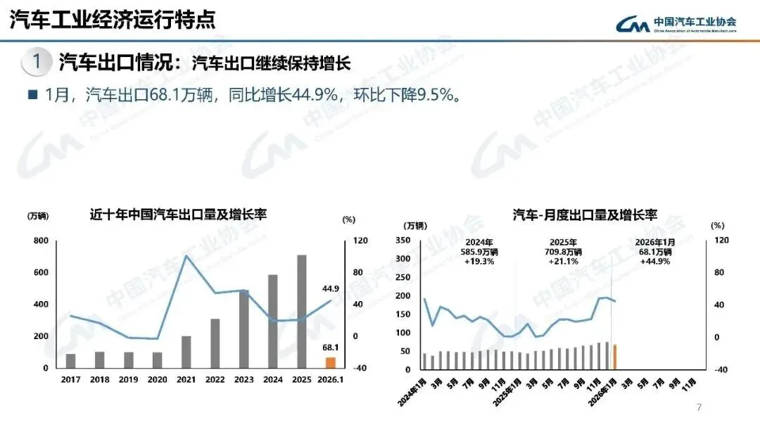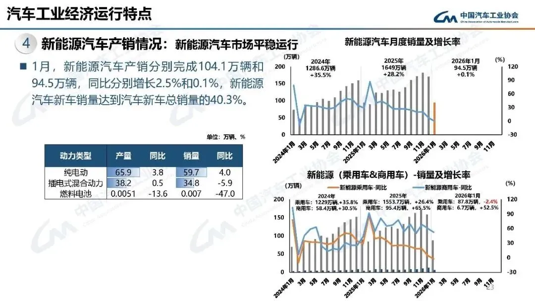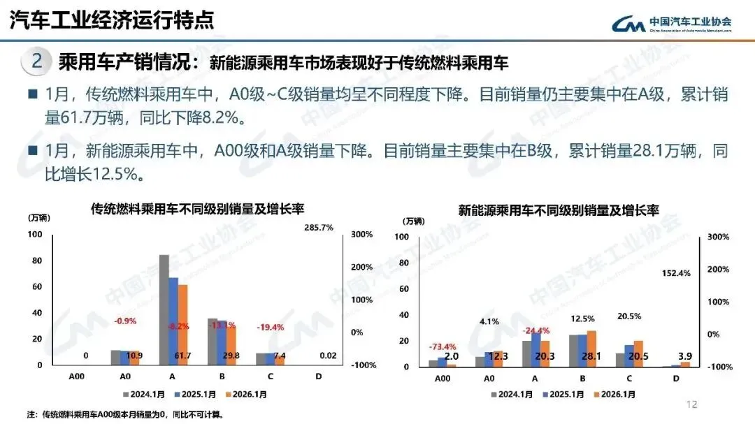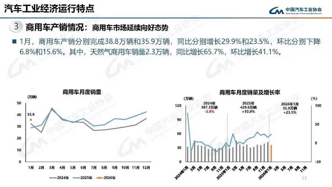 2026年1月,汽车产销分别完成245万辆和234.6万辆,产量同比增长0.01%,销量同比下降3.2%,环比分别下降25.7%和28.3%。