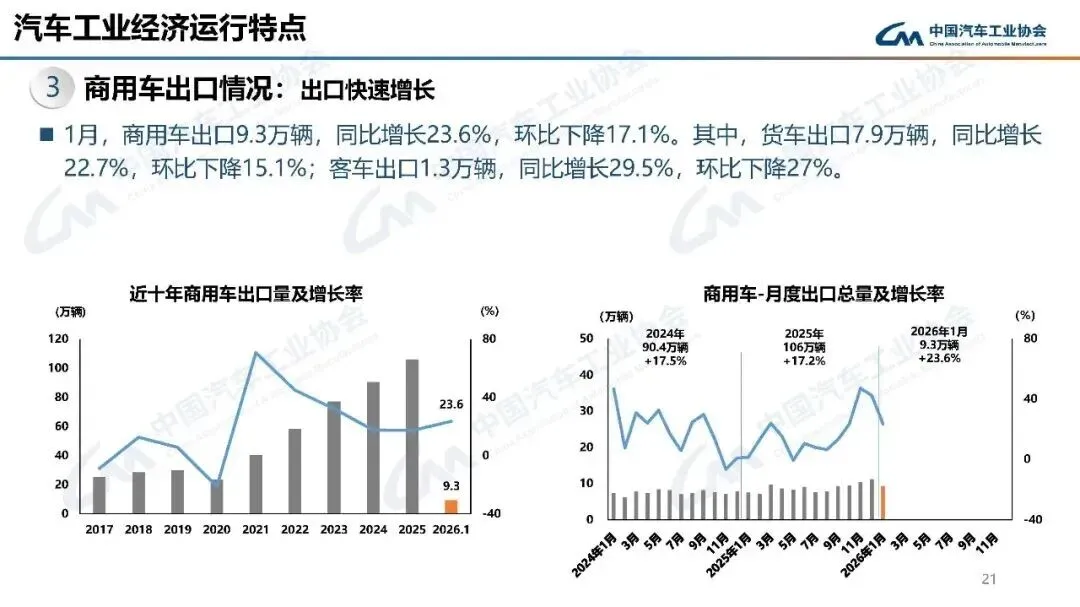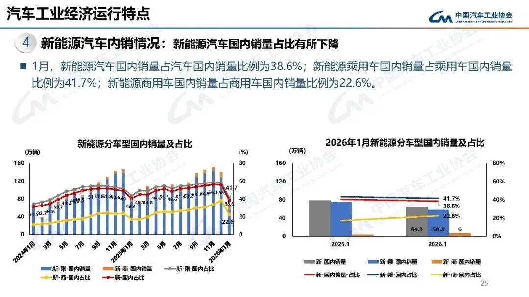 1月,汽车行业总体运行平稳,乘用车市场有所下降,商用车市场延续向好态势,新能源汽车市场平稳运行,汽车出口继续保持增长。导致市场下降的主要因素有:一是新能源汽车购置税政策切换调整;二是多地购车补贴政策处于年度交替之际;三是部分消费需求在2025年提前释放。