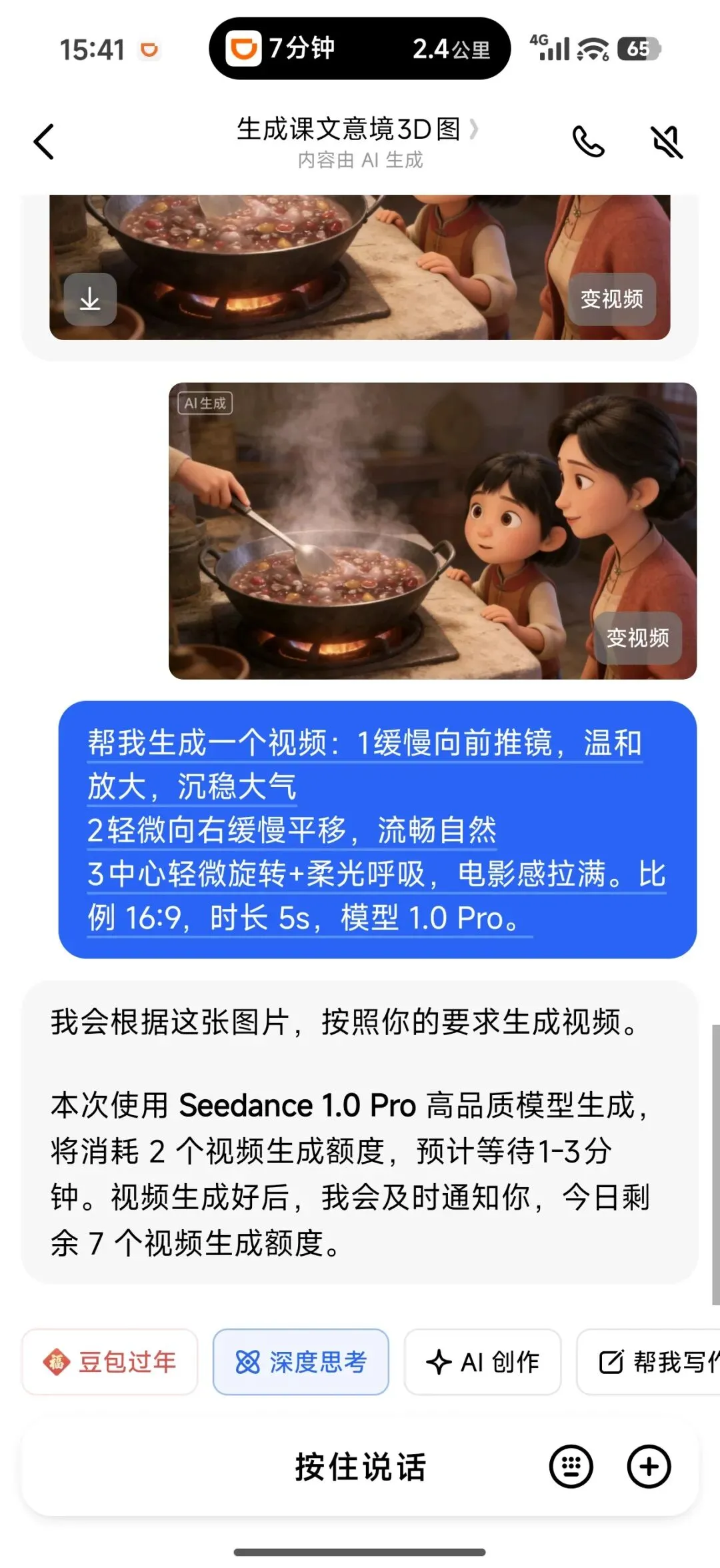 - 1回到豆包 → 视频生成