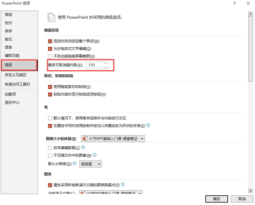 1、增加撤回(Ctrl+Z)步数:系统默认的撤回次数是15次,可通过设置增加撤回步数,文件-选项-高级-最多可取消次数改为150-确定。