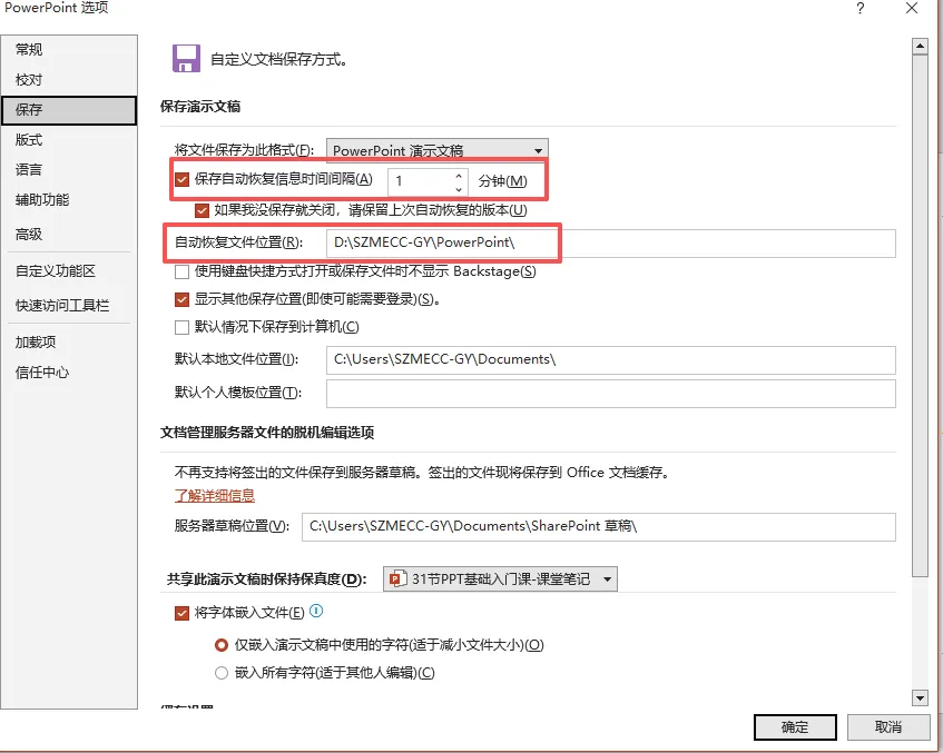 2、自动保存(Ctrl+S) 时长:文件-选项-保存-保存自动恢复信息时间间隔改为1分钟,自动恢复文件位置改为D盘-确定。设置完后电脑每隔1分钟就会自动保存,可防止因突然断电而丢失已做的工作。