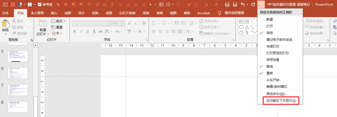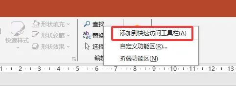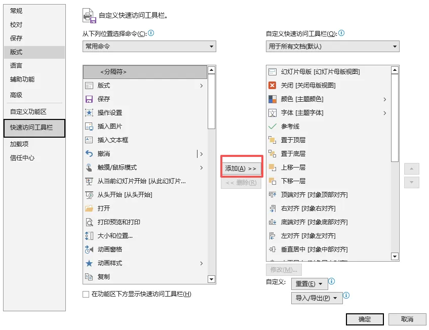 作用:把常用的一些功能操作放在固定位置,从而节省操作时间。例如,我们经常要对已做的ppt保存,防止突然断电丢失,正常是要点击“文件”,找到“保存”点击,如果报保存工具栏放在固定位置,点击保存按钮即可。方法1:在想要添加的工具栏处右击-添加到快速访问工具栏。方法2:开始-选项-快速访问工具栏,将常用的工具栏添加到右侧。快速访问工具栏位置:添加完了快速访问工具栏后,其位置根据个人习惯,一般置于功能区上方或下方,设置方法:点击快速访问工具栏最后的小三角-点击“在功能区下方显示”/“在功能区上方显示”。快速访问工具栏可按照不同的功能、使用的场景进行分类,例如常用频率高的保存、另存为、撤销、重复、格式刷等工具放一起,置于顶层、置于底层、上移一层、下移一层的图层调整工具放一起。