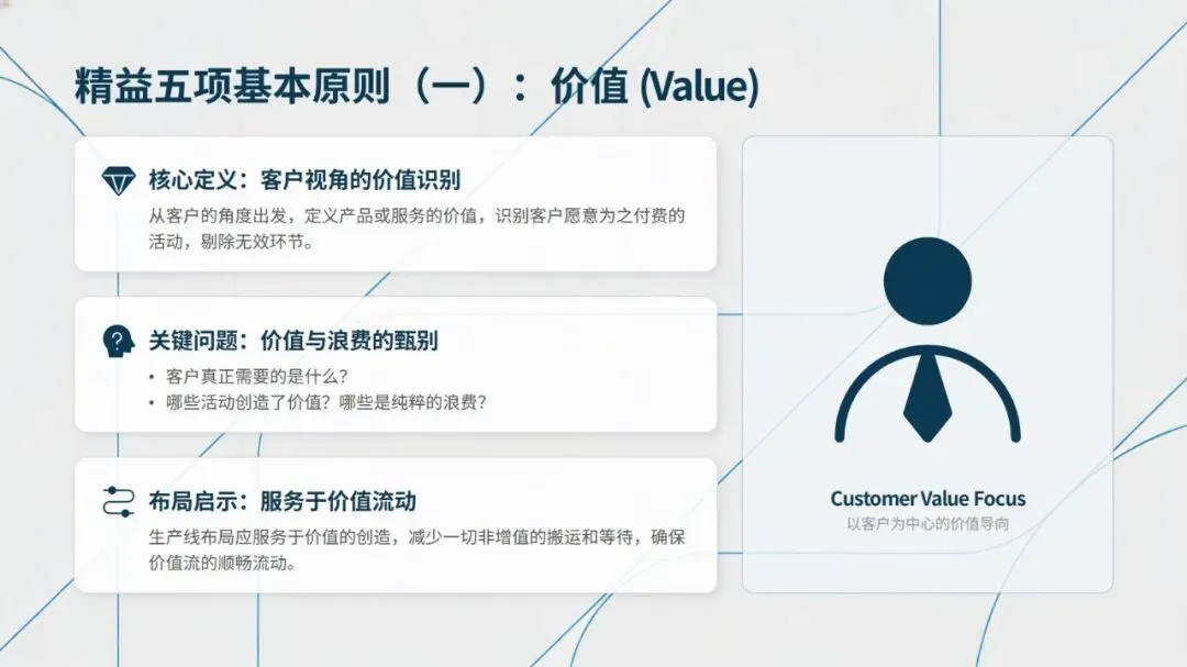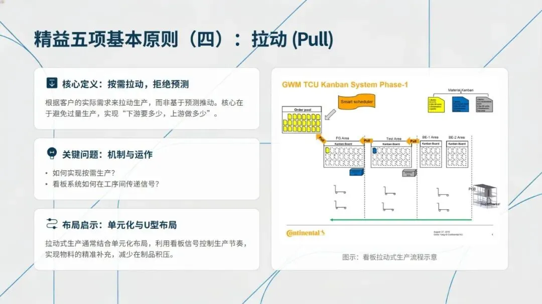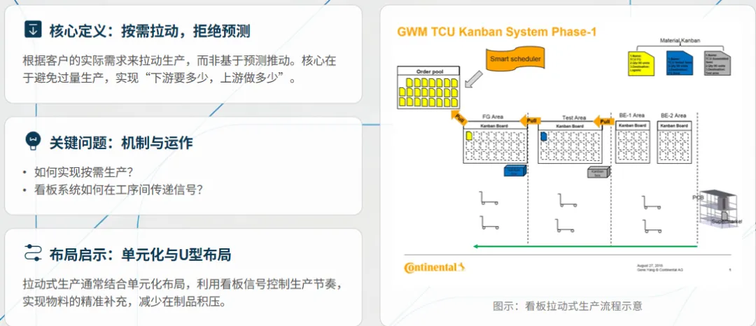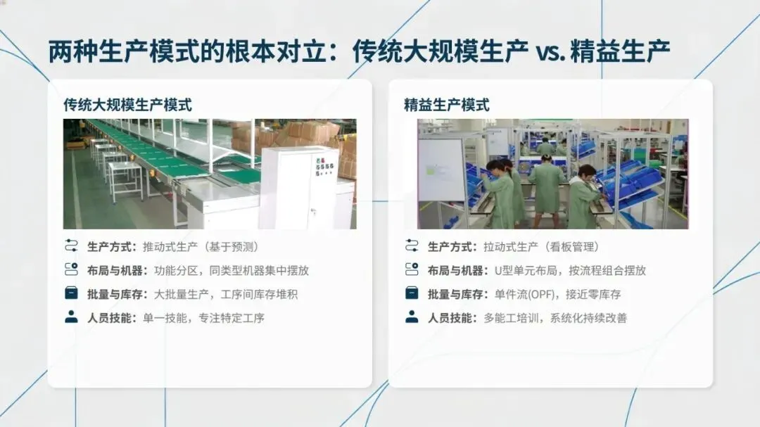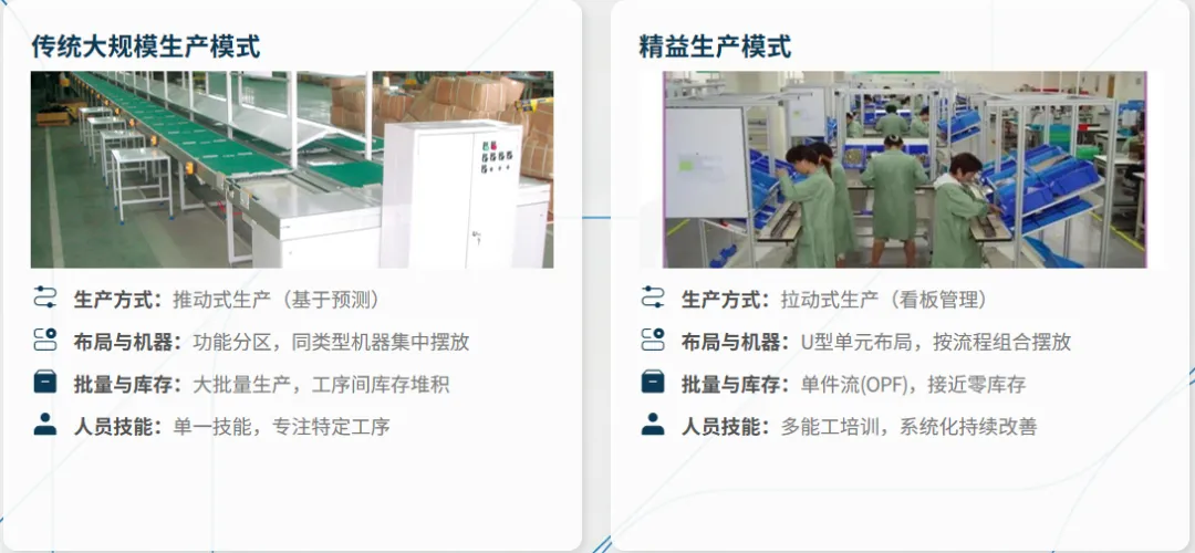 精益生产的核心是完成从推动式到拉动式的转变,遵循价值、价值流、流动、拉动、尽善尽美五项基本原则,以客户需求定义价值,通过价值流图识别浪费,追求单件流的顺畅生产,依托看板管理实现按需生产,并建立全员参与的持续改善机制。相较于传统生产的功能分区、批量库存、单技能人员模式,精益生产以U型单元布局、多能工体系为核心,实现接近零库存的生产状态。