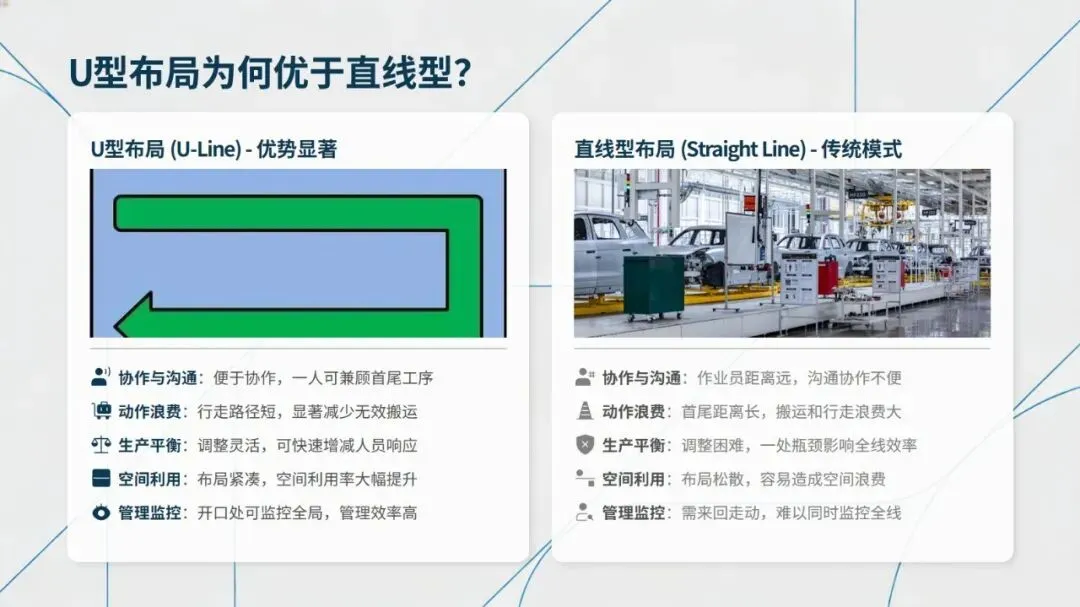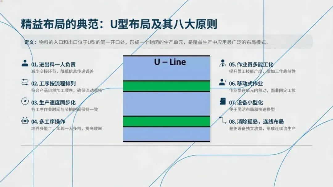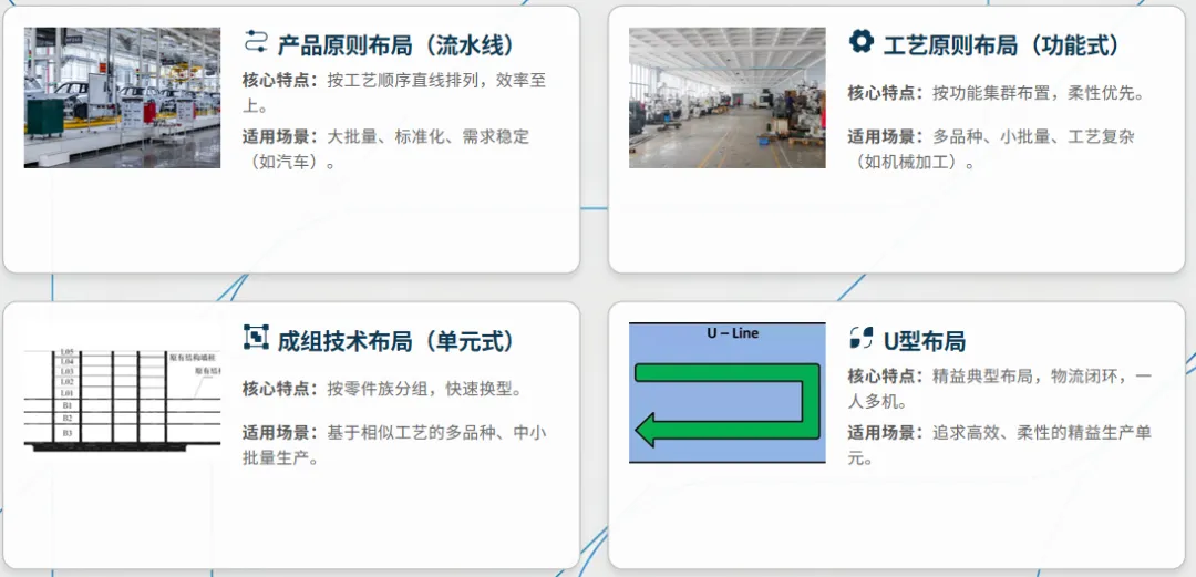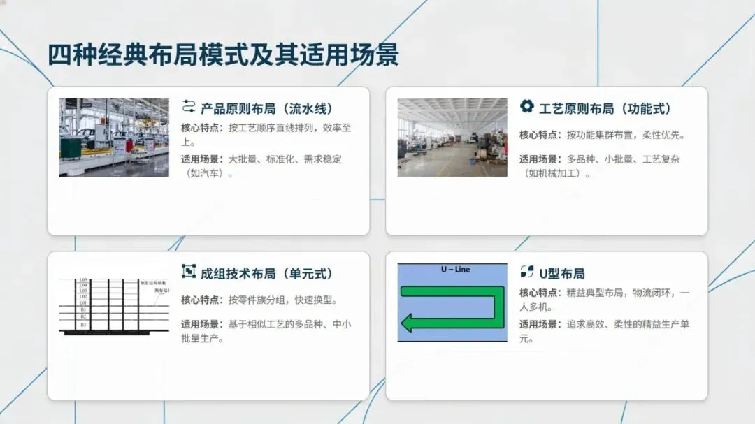 生产线布局有产品原则、工艺原则、成组技术、U型布局四种经典模式,各有适配场景:产品原则布局效率至上,适合大批量标准化生产;工艺原则布局柔性强,适配多品种小批量的机械加工等领域;成组技术布局按零件族分组,支持快速换型;U型布局作为精益典范,以物流闭环、一人多机为特点,遵循进出料合一、工序顺排等八大原则,在协作效率、空间利用等方面远优于直线型布局。