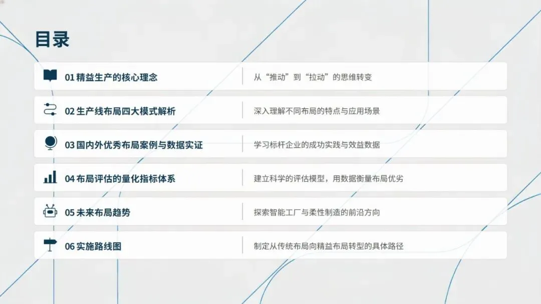 精益生产线布局的核心是打造高效、柔性、可持续的生产模式,实现从传统大规模生产到精益生产的思维与实践转型,整体围绕核心理念、布局模式、标杆案例、评估体系、未来趋势及实施路径六大维度,构建起精益布局的完整体系。
